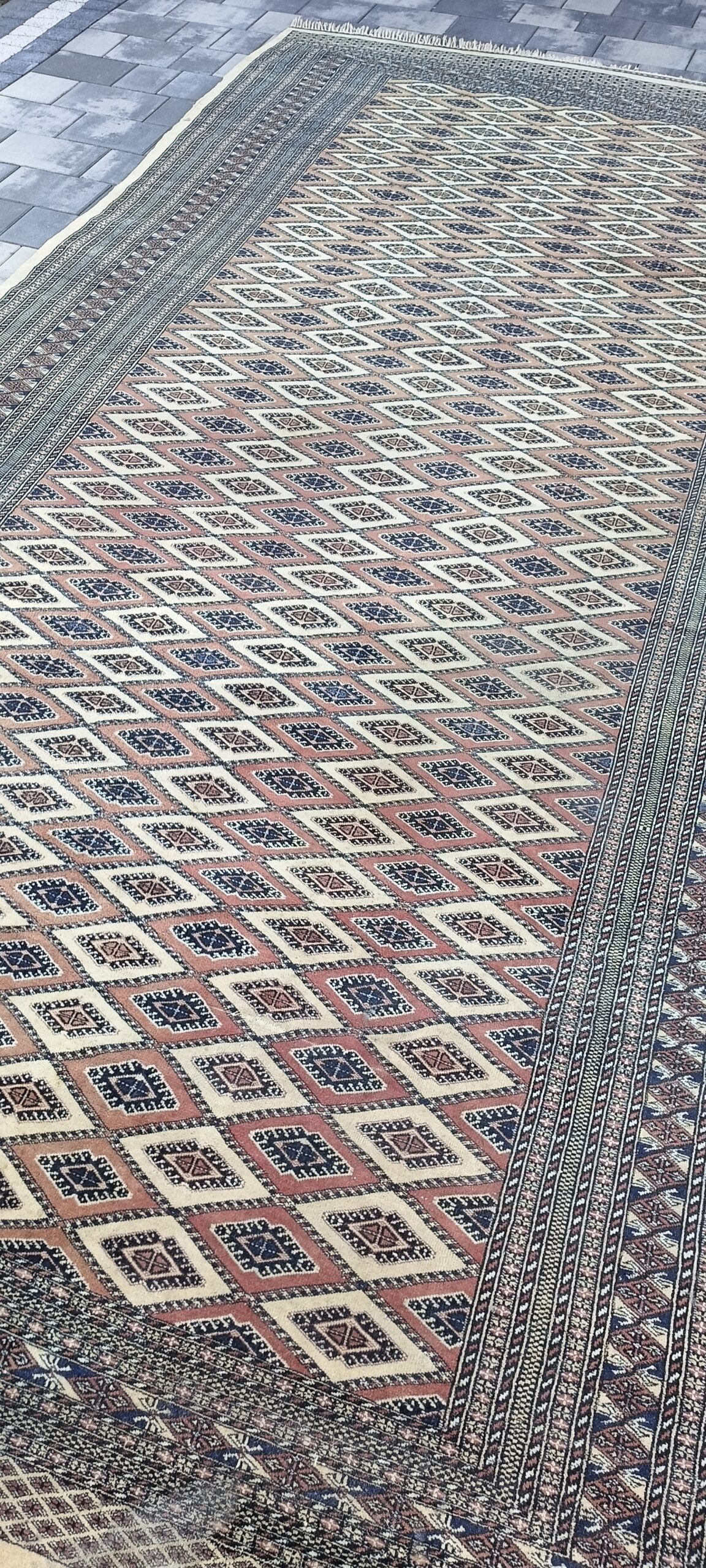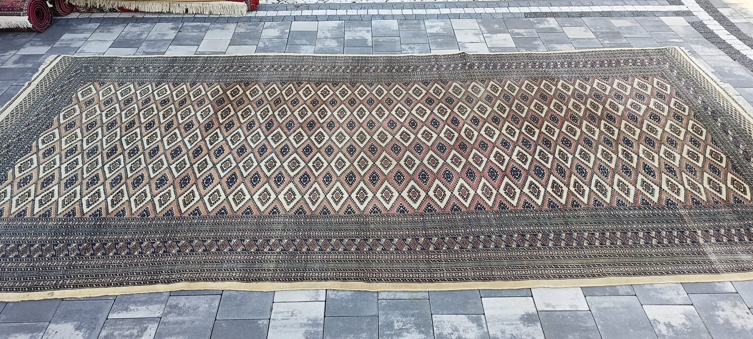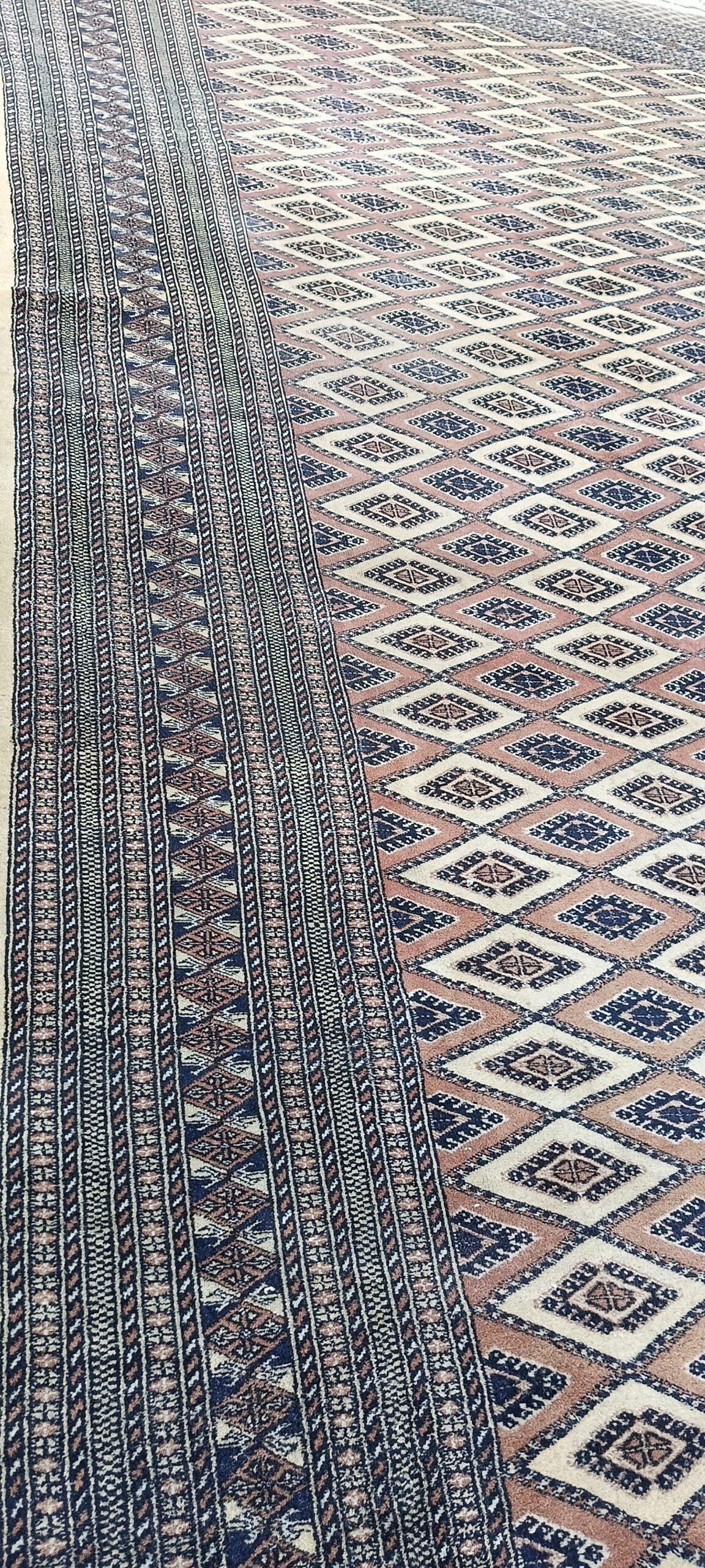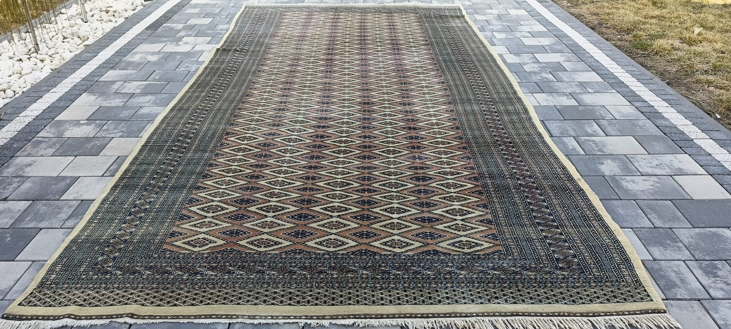 Na sprzedaż oferuję unikatowy, ręcznie tkany dywan wełniany typu Jaldar. Jest to egzemplarz o rzadko spotykanych, imponujących wymiarach 392 cm x 192 cm.