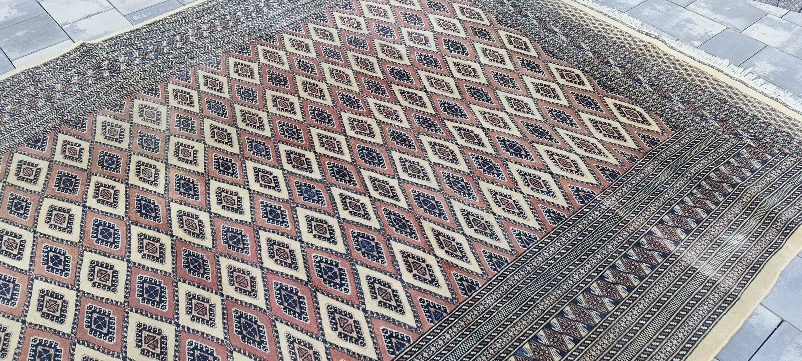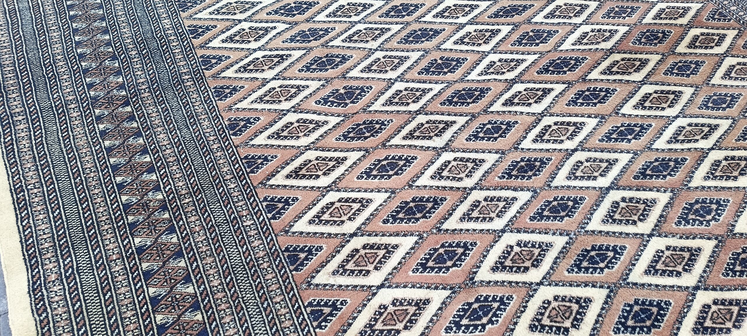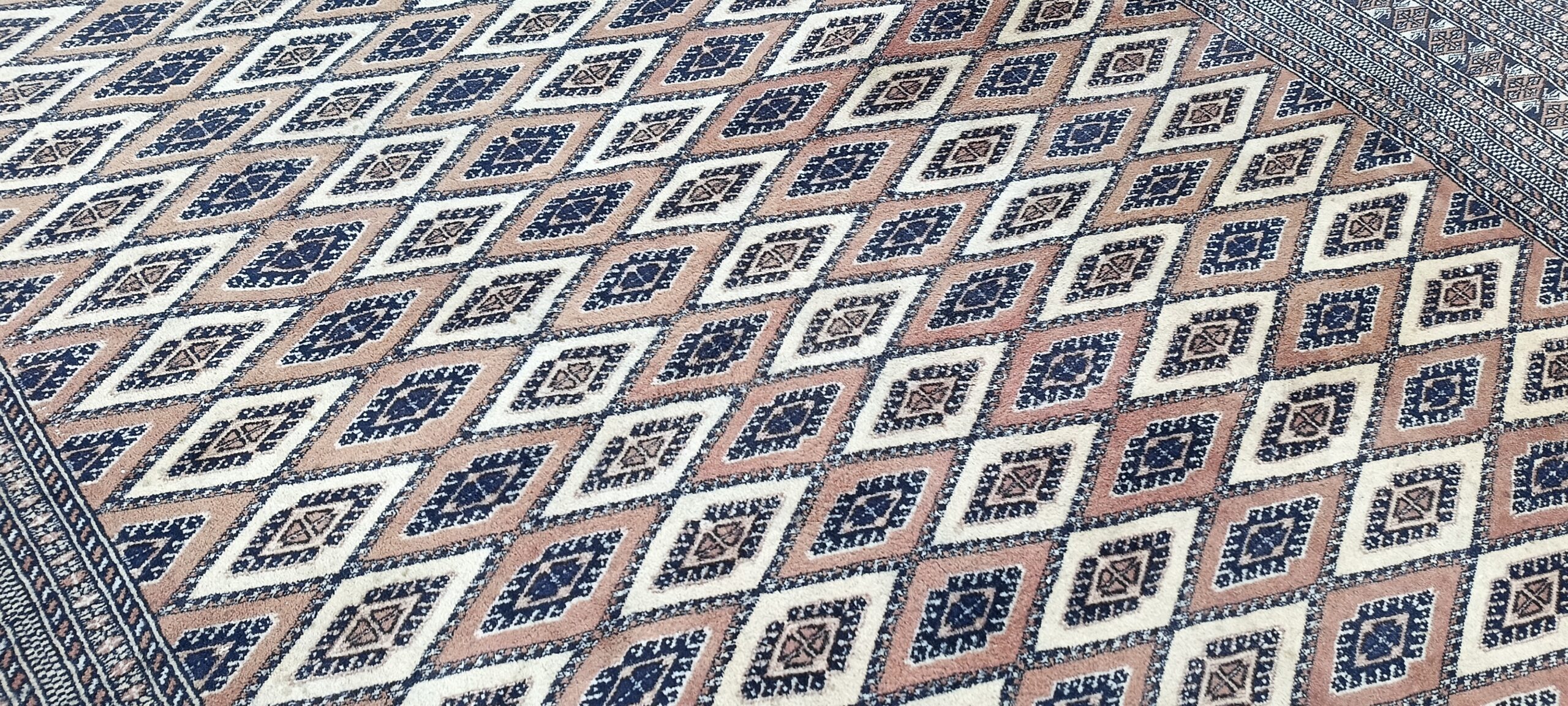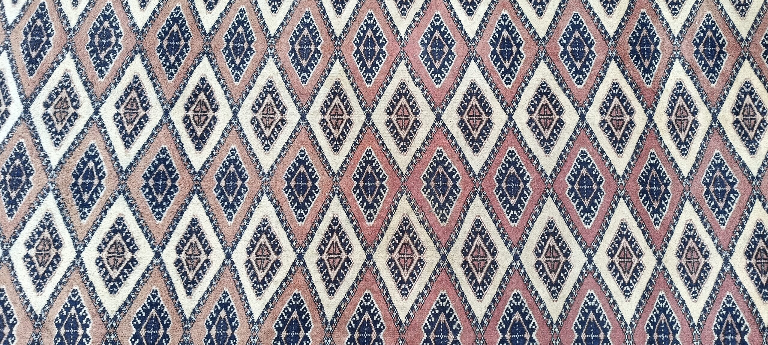 Dywan zachwyca gęstym, geometrycznym wzorem w diamenty, który jest znakiem rozpoznawczym tradycyjnego rzemiosła afgańskiego. Dzięki precyzyjnemu wykonaniu i krótkim, gęstym runie, dywan ma piękny połysk i zmienia odcienie w zależności od kąta padania światła.