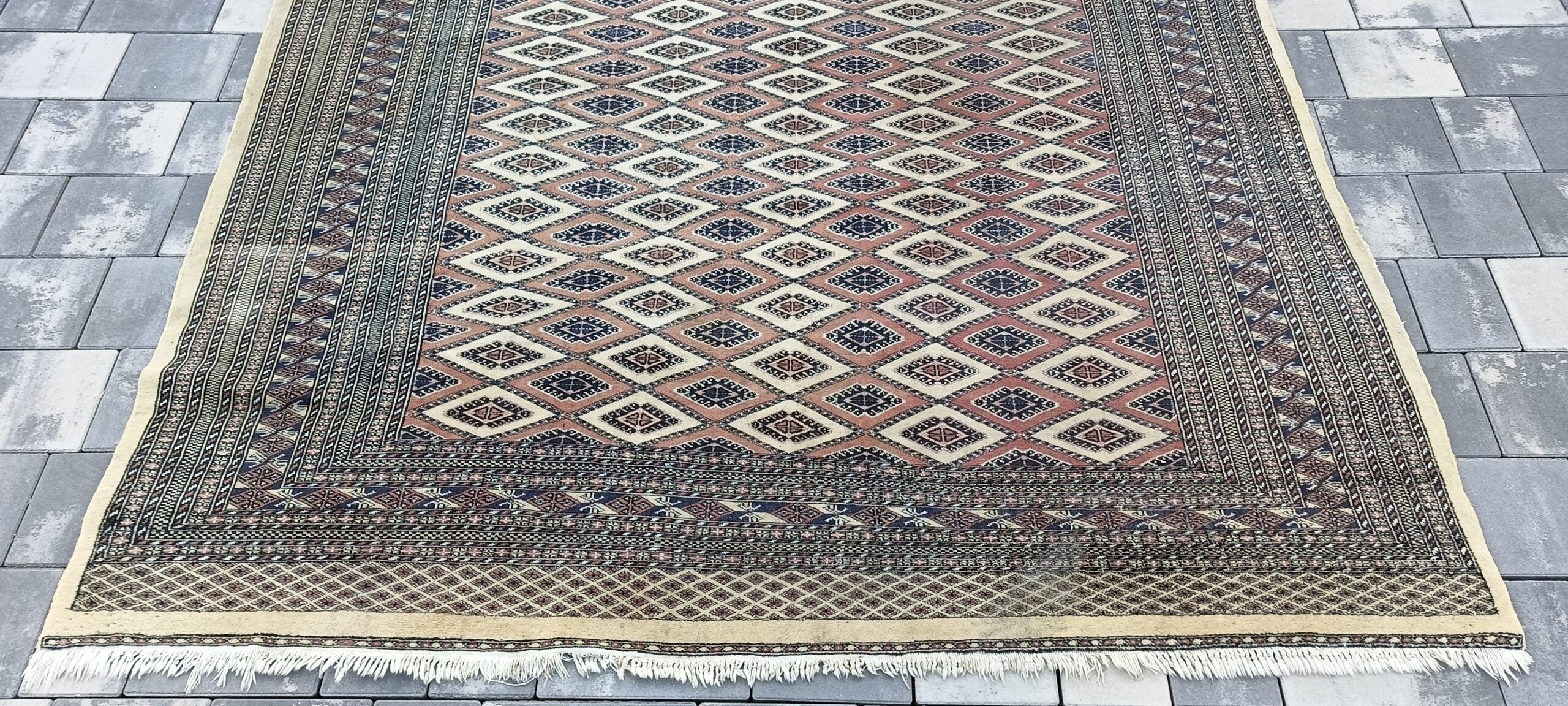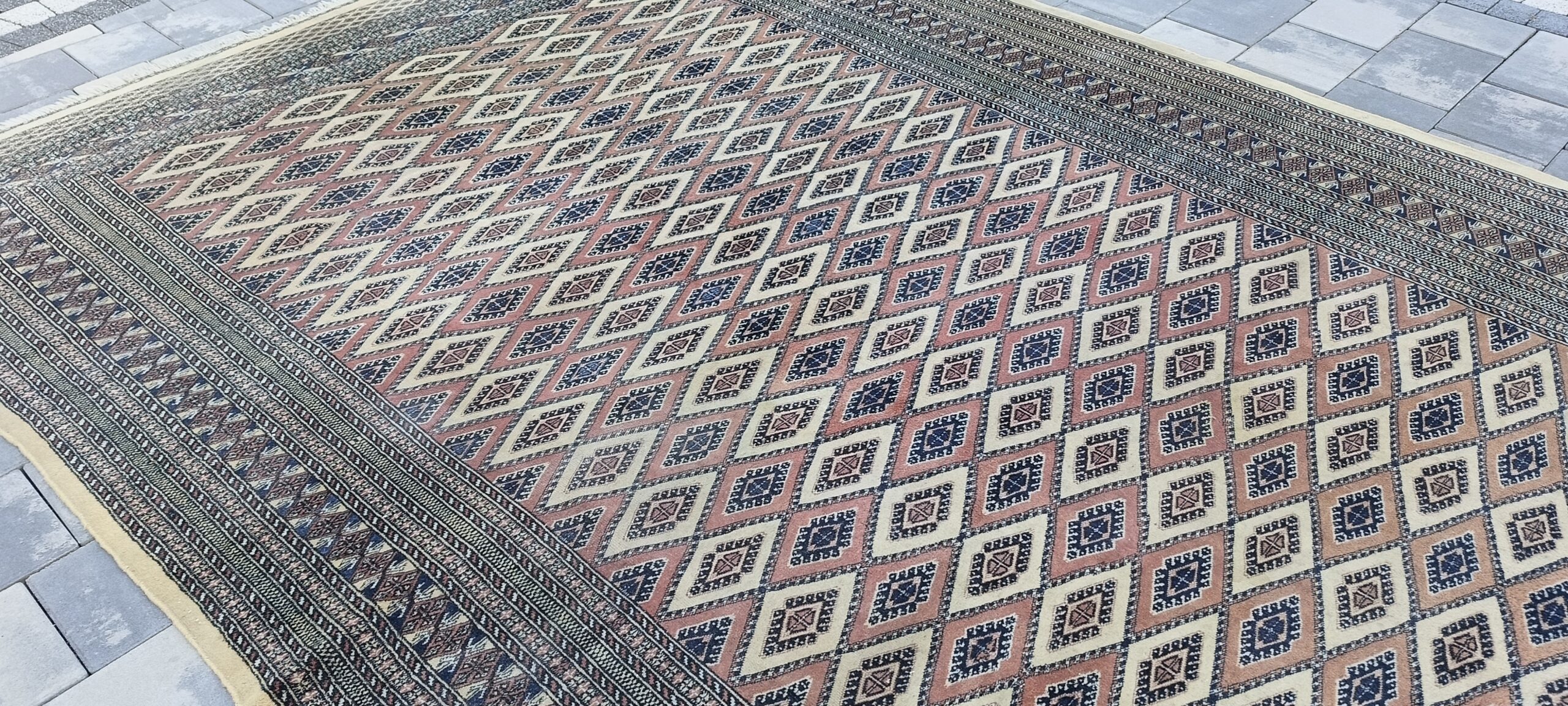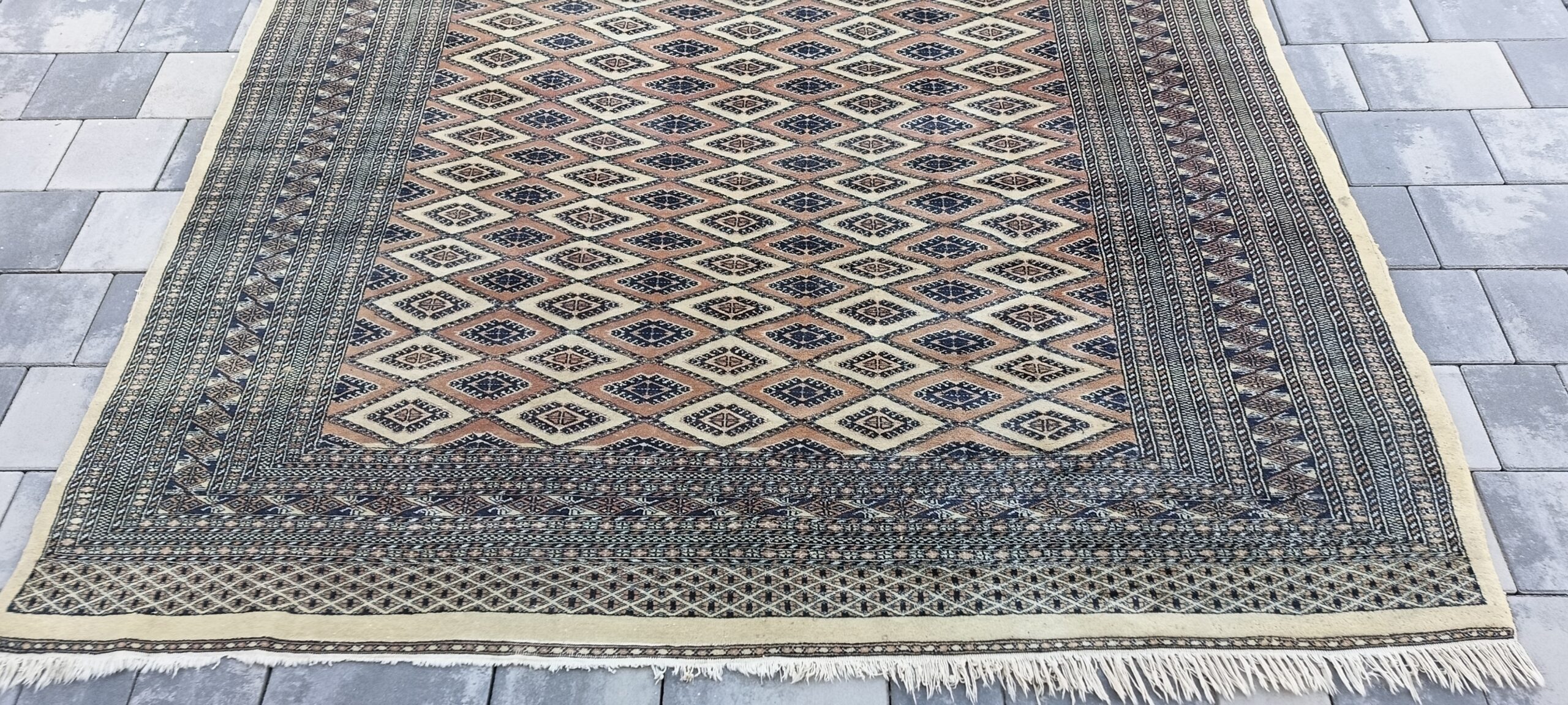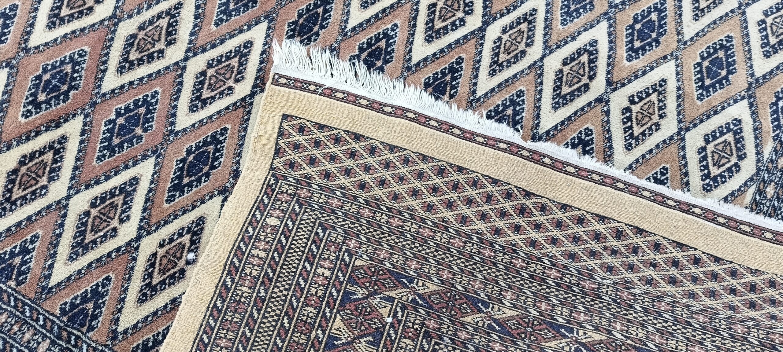 Dywan zachwyca gęstym, geometrycznym wzorem w diamenty, który jest znakiem rozpoznawczym tradycyjnego rzemiosła afgańskiego. Dzięki precyzyjnemu wykonaniu i krótkim, gęstym runie, dywan ma piękny połysk i zmienia odcienie w zależności od kąta padania światła.