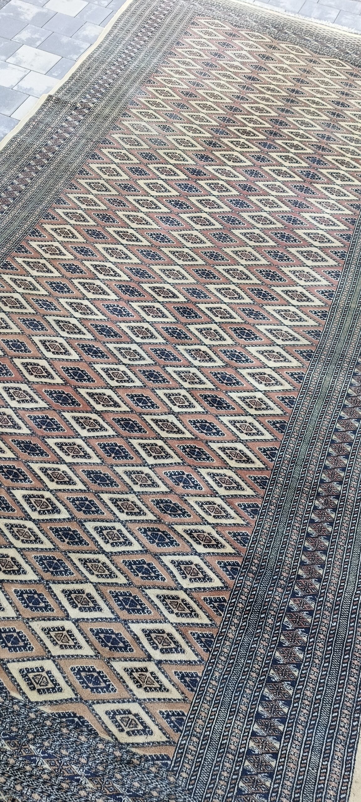 Dywan jest czysty, zadbany i prezentuje się niezwykle okazale. Jako przedmiot używany, posiada naturalne, drobne przetarcia runa, które są typowe dla wiekowych, ręcznie tkanych wyrobów wełnianych. Nie wpływają one na trwałość dywanu, a jedynie nadają mu szlachetnej patyny i autentycznego wyglądu „distressed vintage”. Brak dziur, plam czy nieprzyjemnych zapachów. Dywan gotowy do bezpośredniego rozłożenia w salonie.