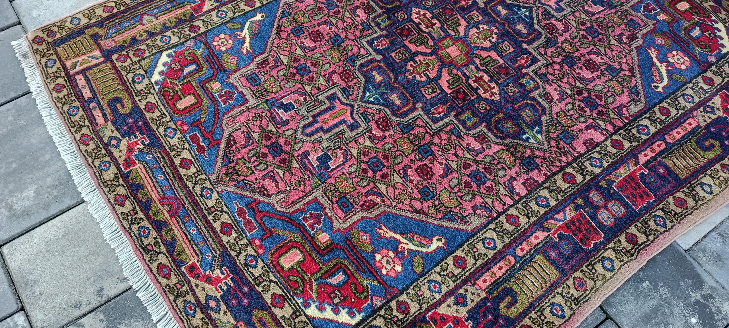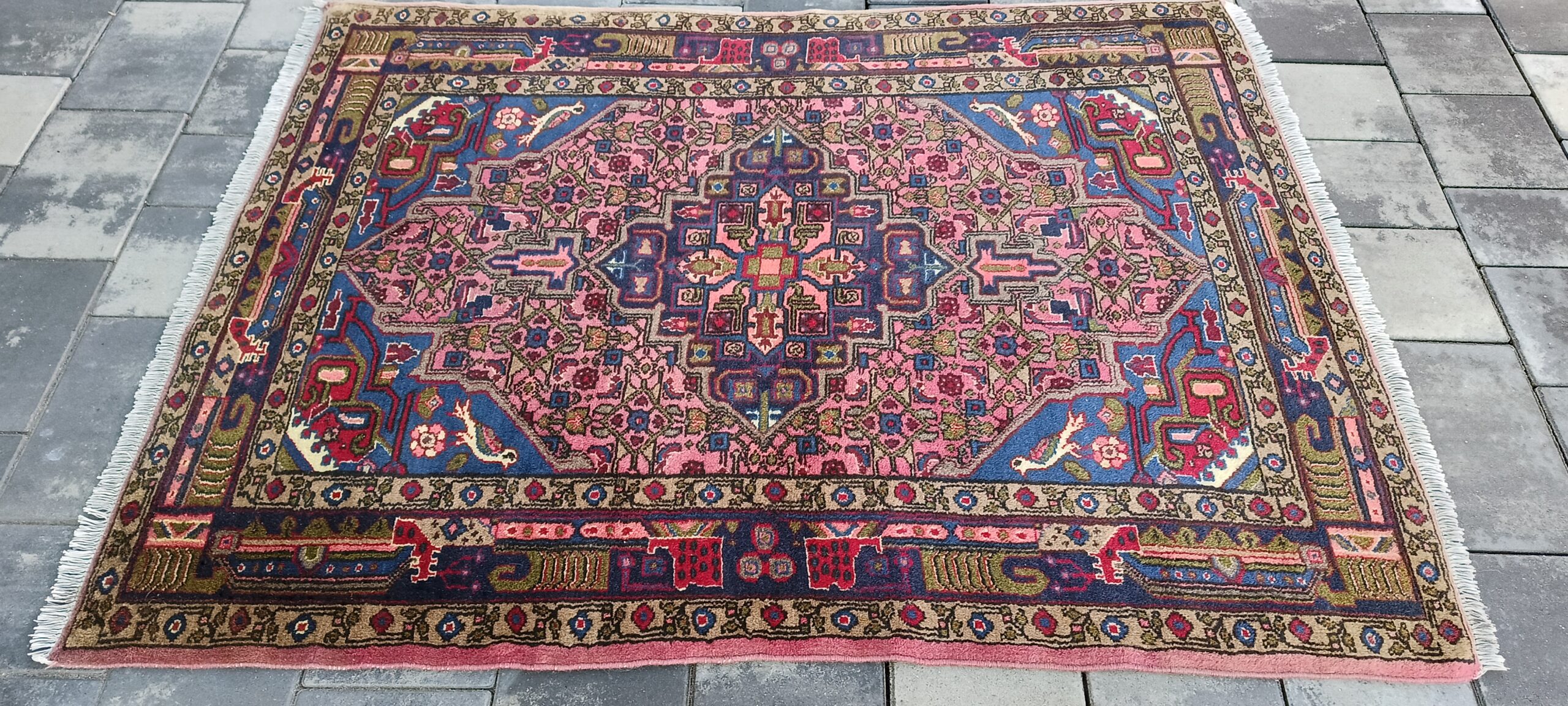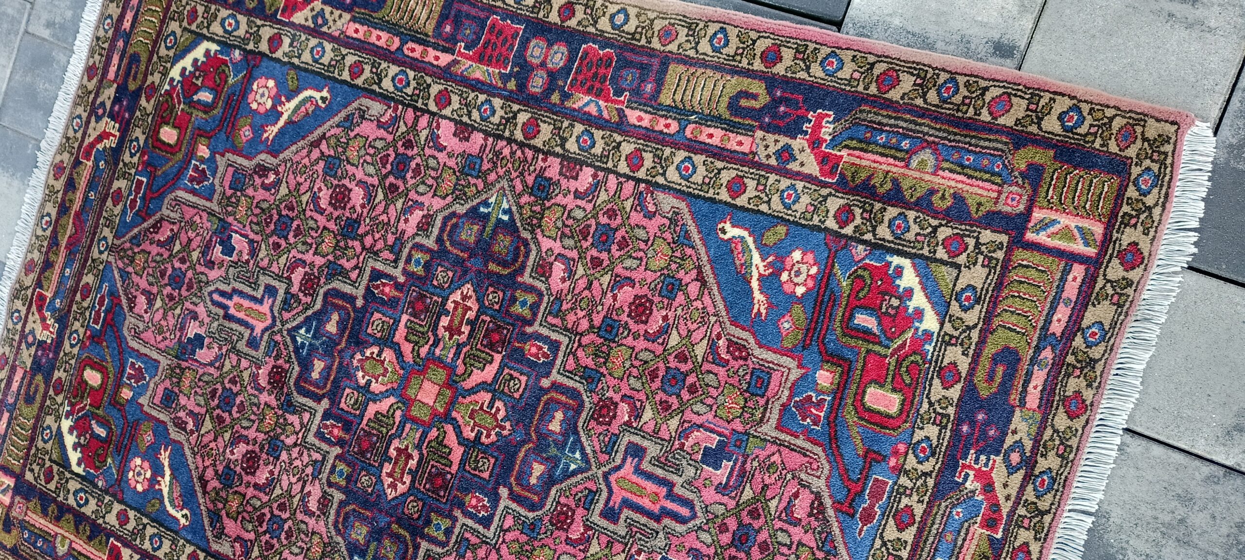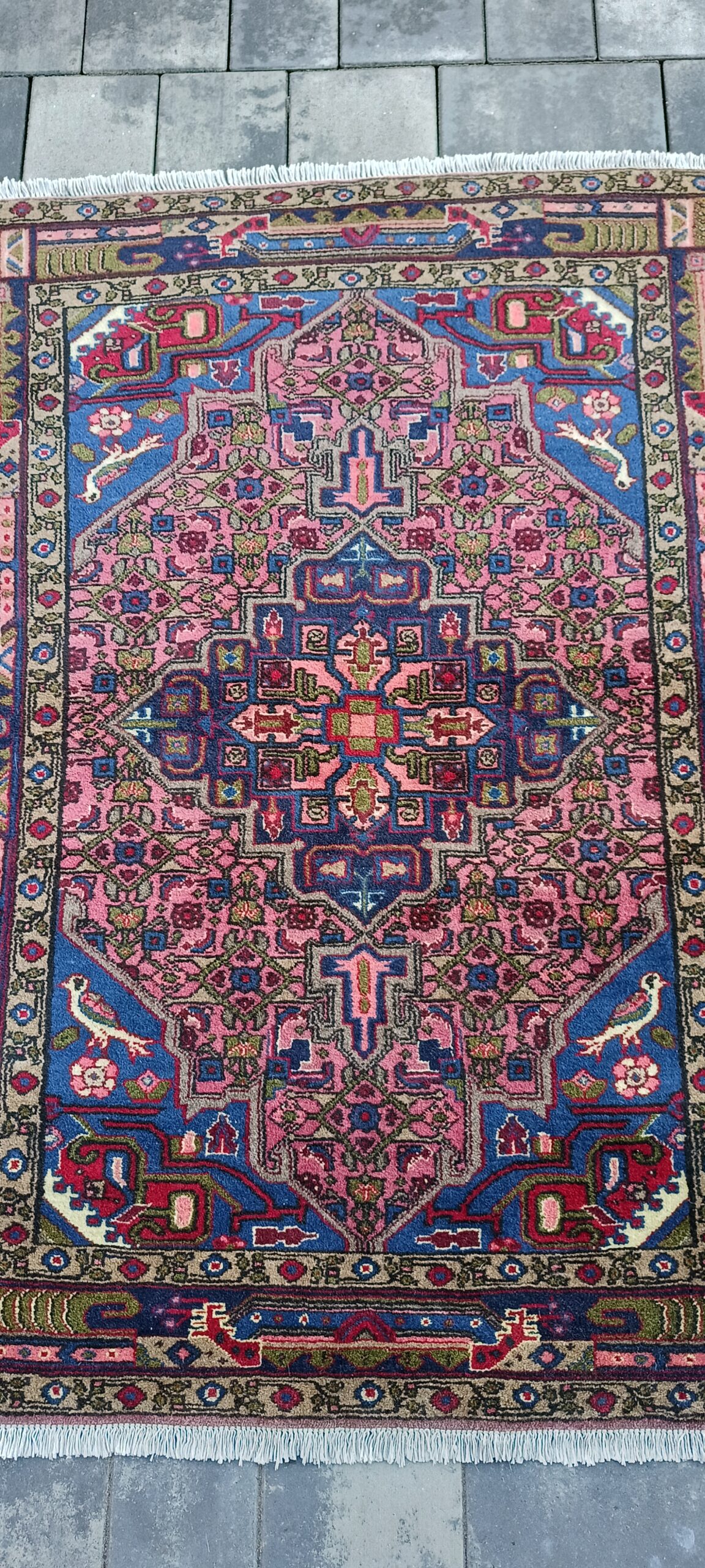 Na sprzedaż oferuję autentyczny, ręcznie tkany dywan perski pochodzący z regionu Hamadan (północno-zachodni Iran). Dywan charakteryzuje się piękną, nasyconą kolorystyką (róż, błękit indygo, zieleń) oraz tradycyjnym, geometrycznym wzornictwem z centralnym medalionem.
