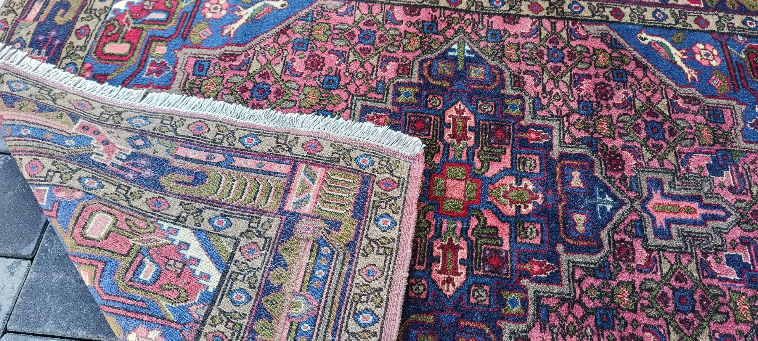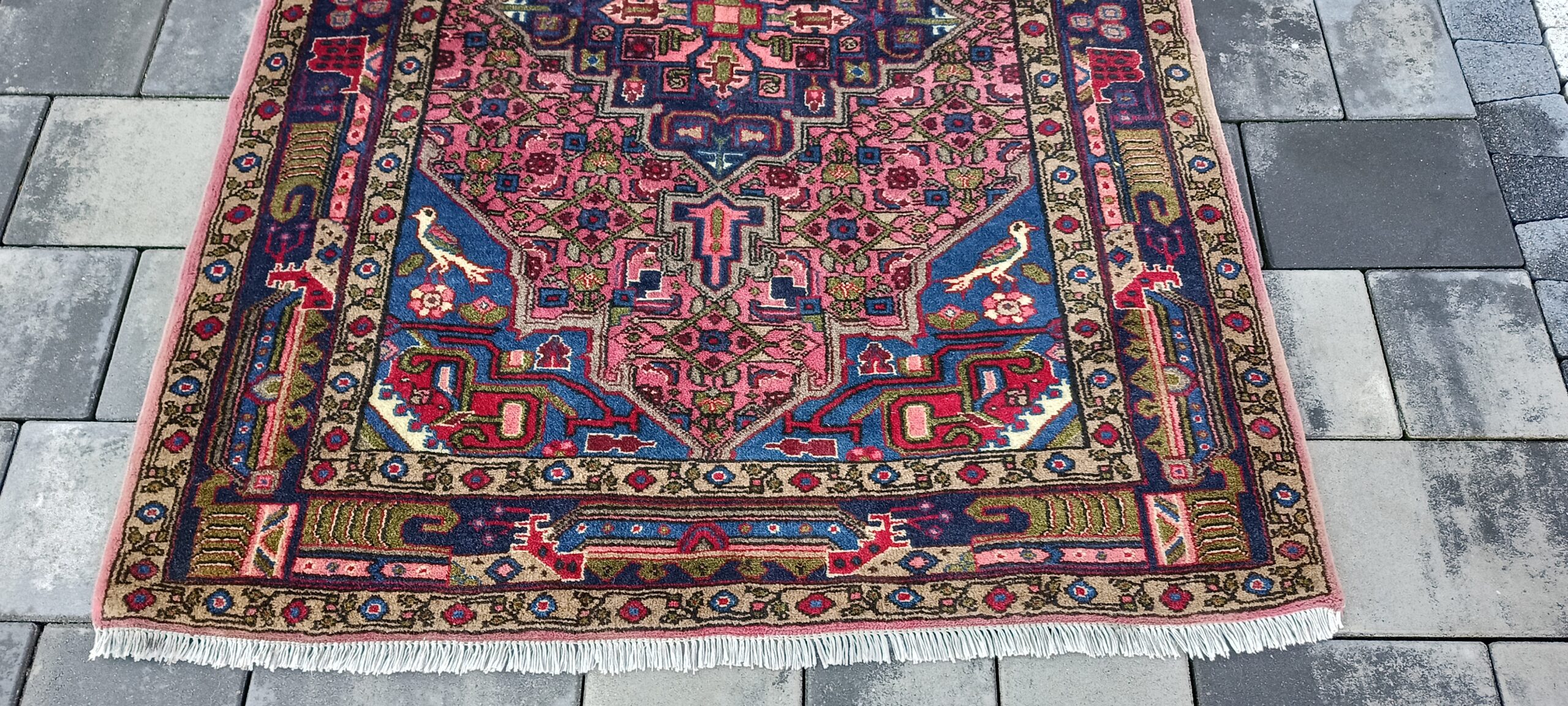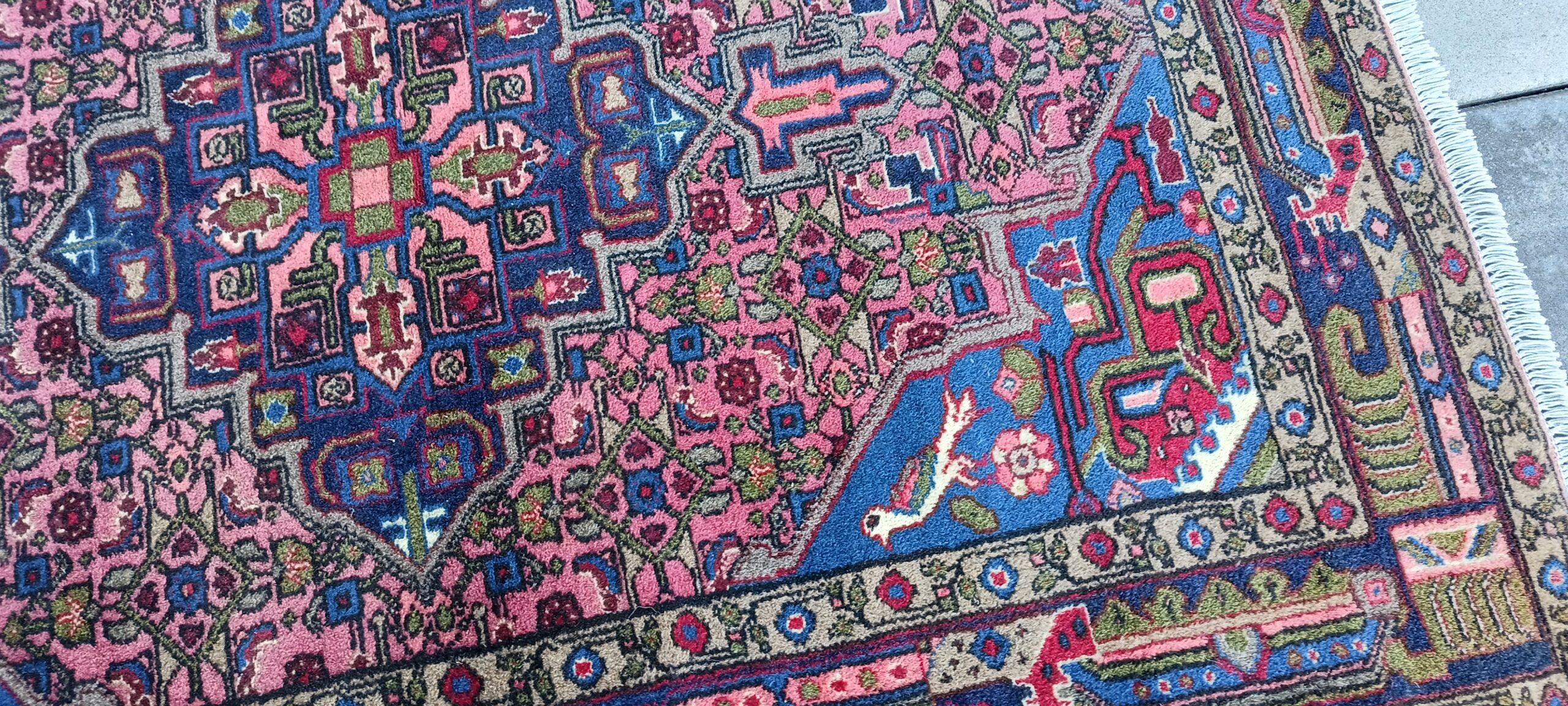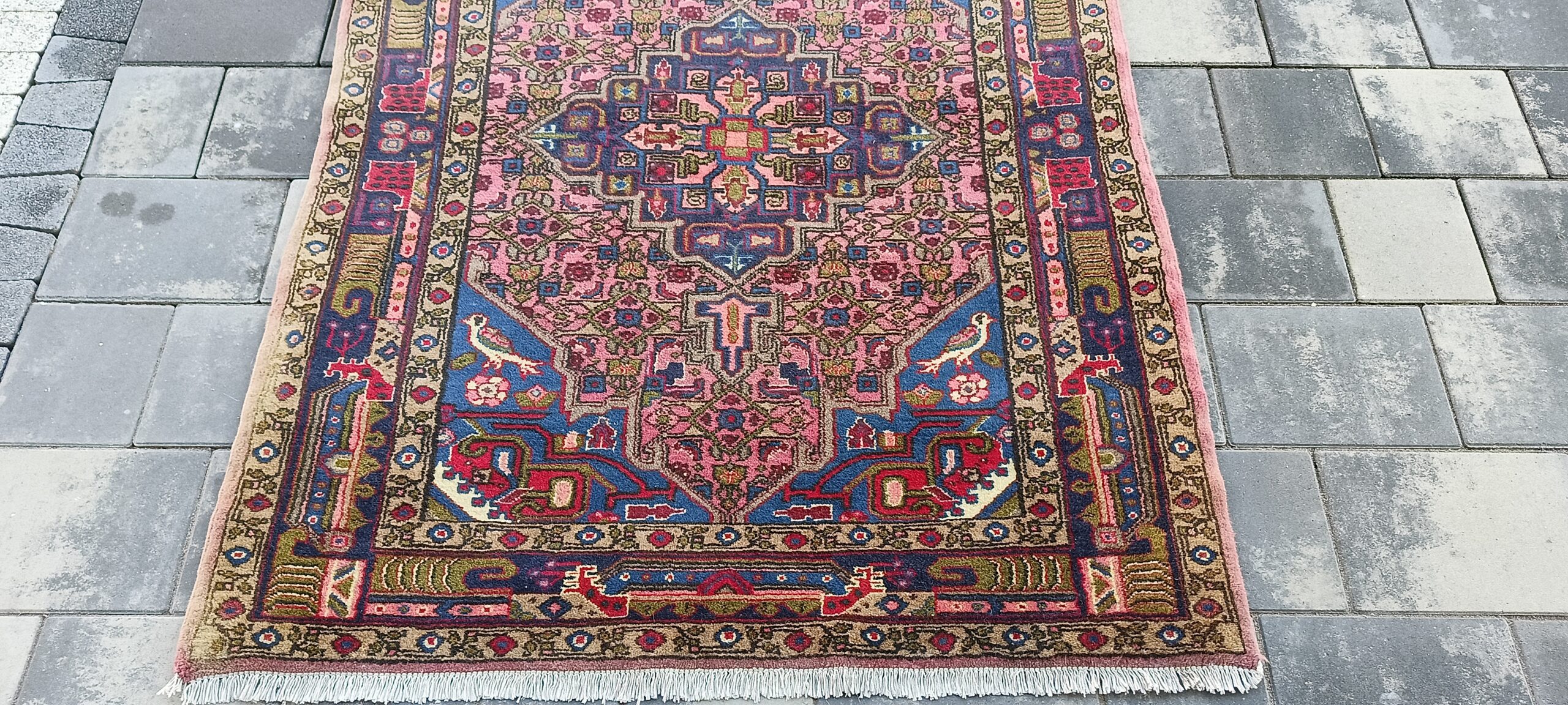 Na sprzedaż oferuję autentyczny, ręcznie tkany dywan perski pochodzący z regionu Hamadan (północno-zachodni Iran). Dywan charakteryzuje się piękną, nasyconą kolorystyką (róż, błękit indygo, zieleń) oraz tradycyjnym, geometrycznym wzornictwem z centralnym medalionem.