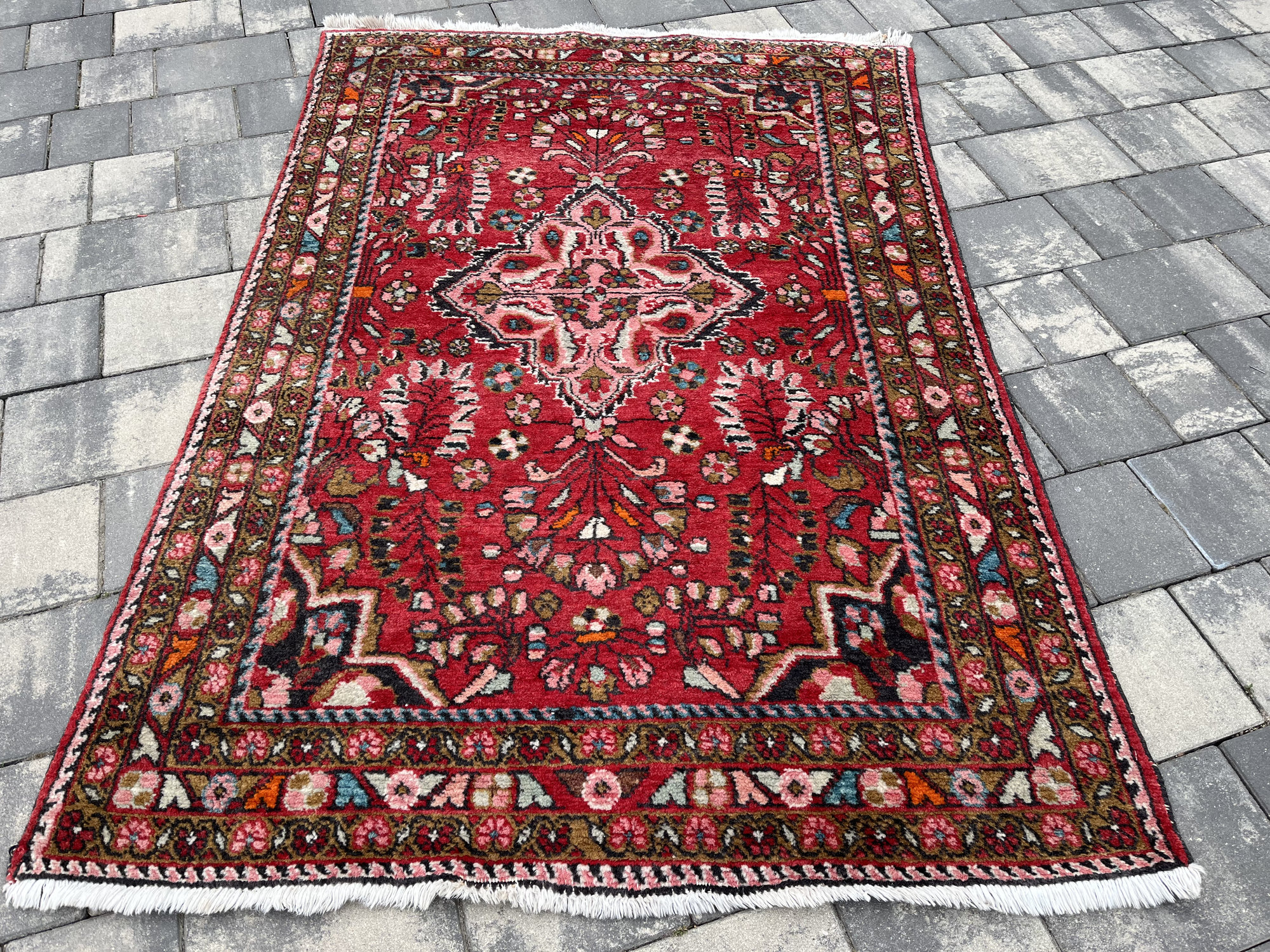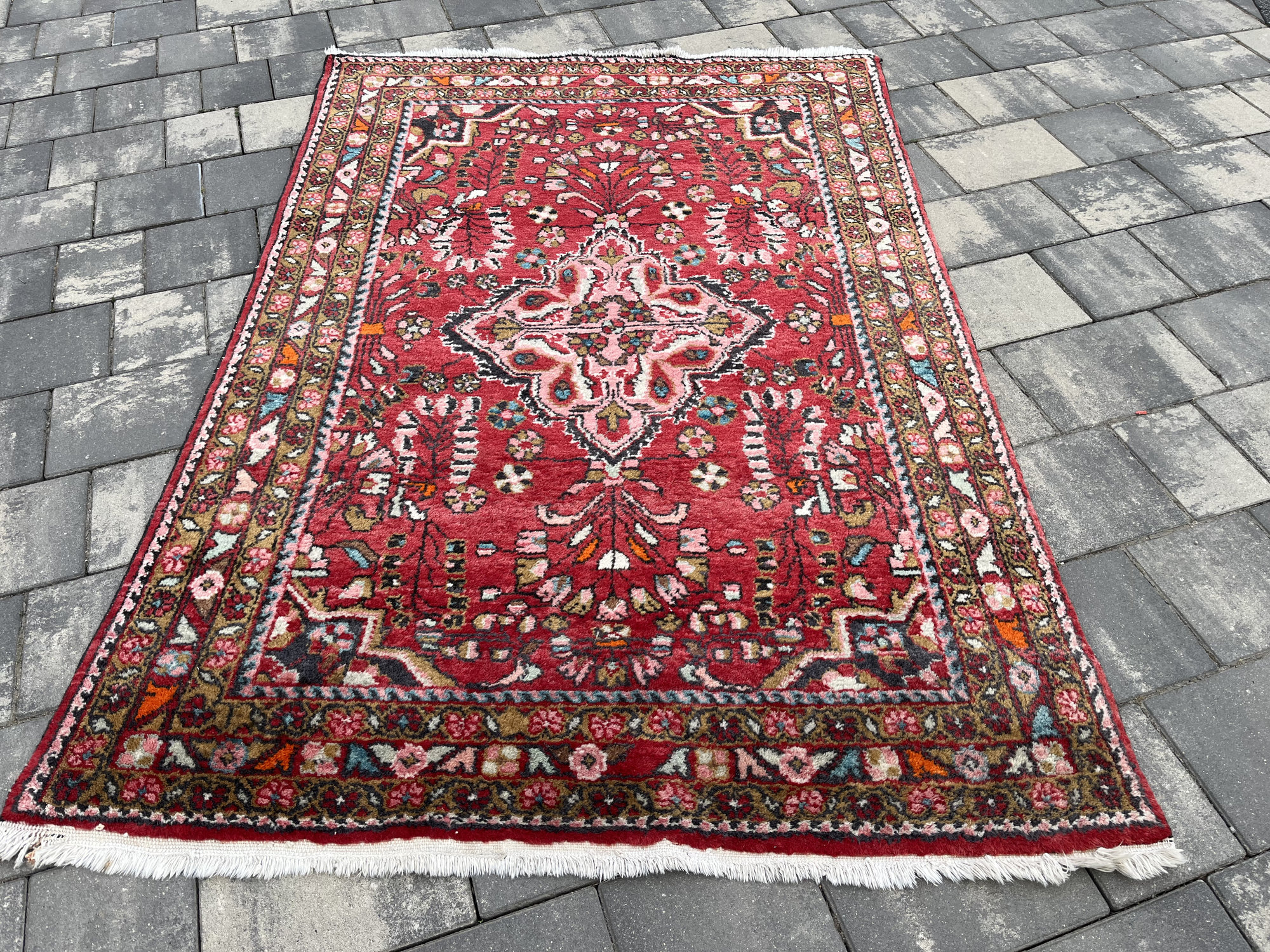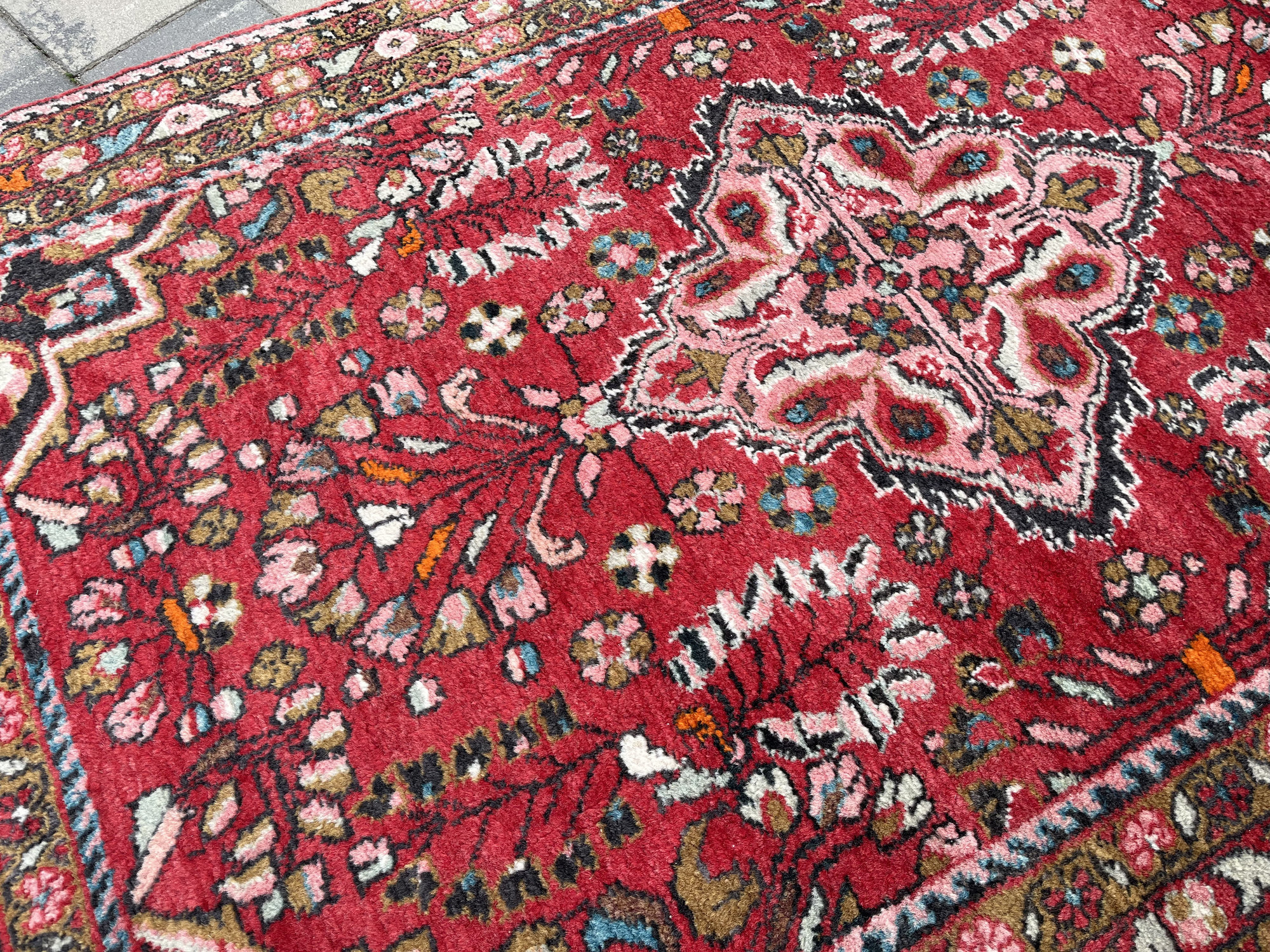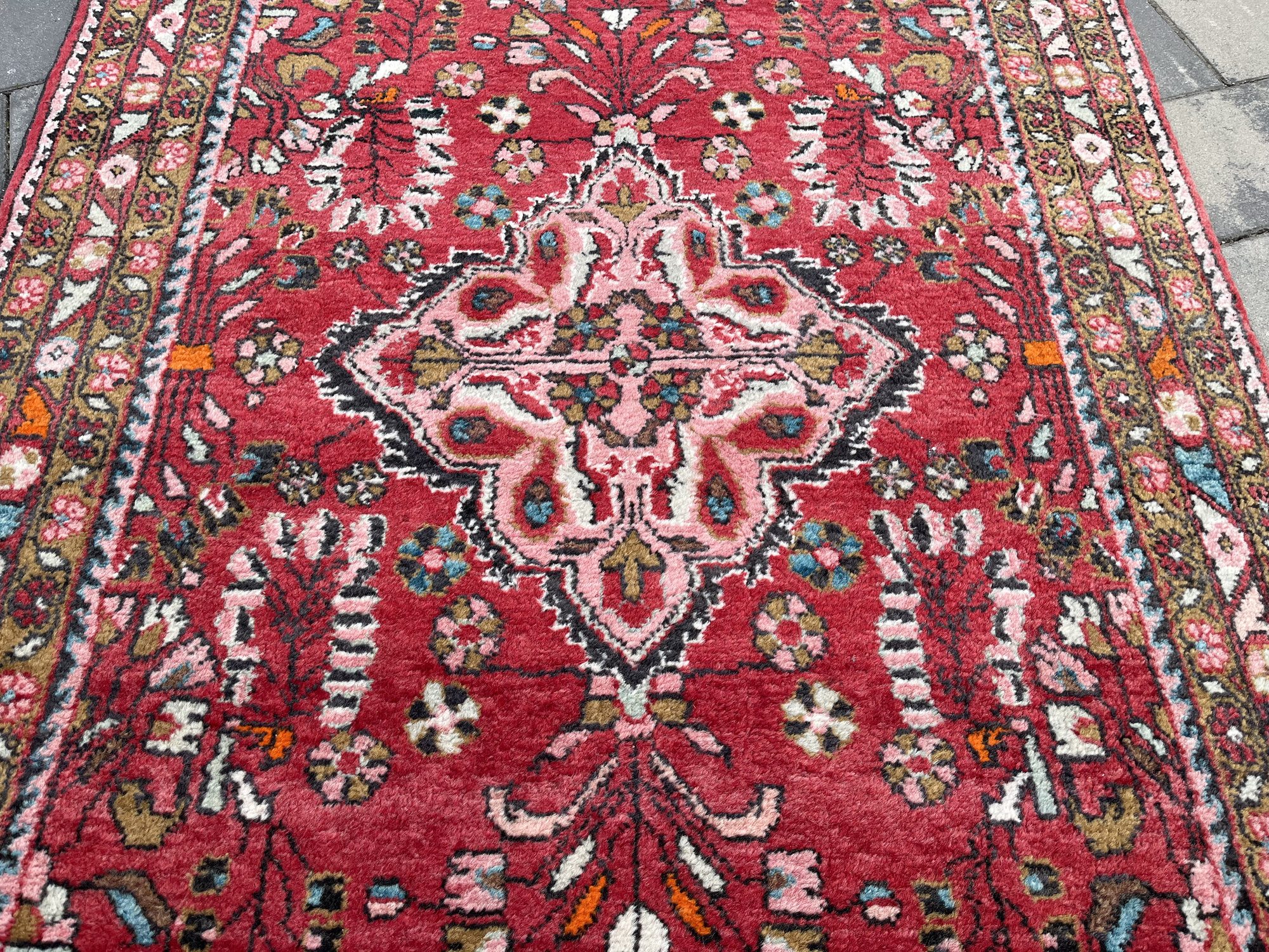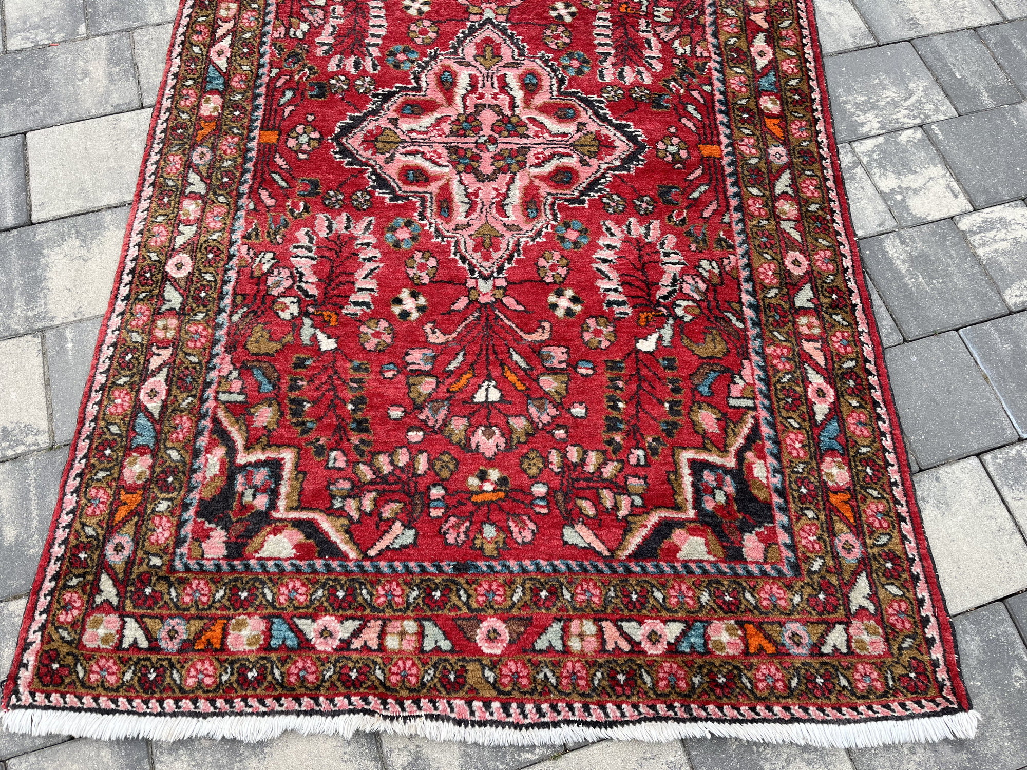 Wzornictwo: Charakterystyczny dla Hamadanów wyrazisty medalion centralny wpisany w pole o intensywnej, czerwonej barwie. Całość dopełnia bogata bordiura z motywami roślinnymi w odcieniach błękitu, różu i zieleni.