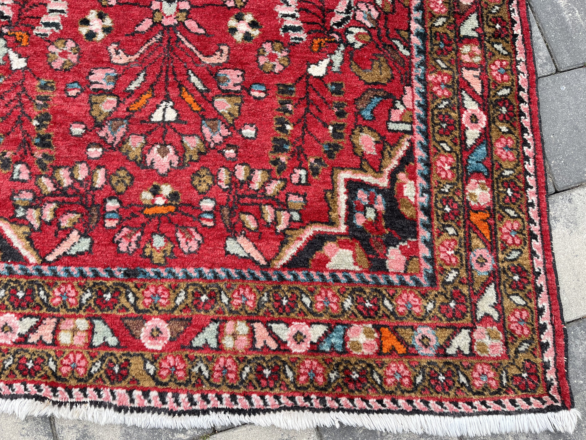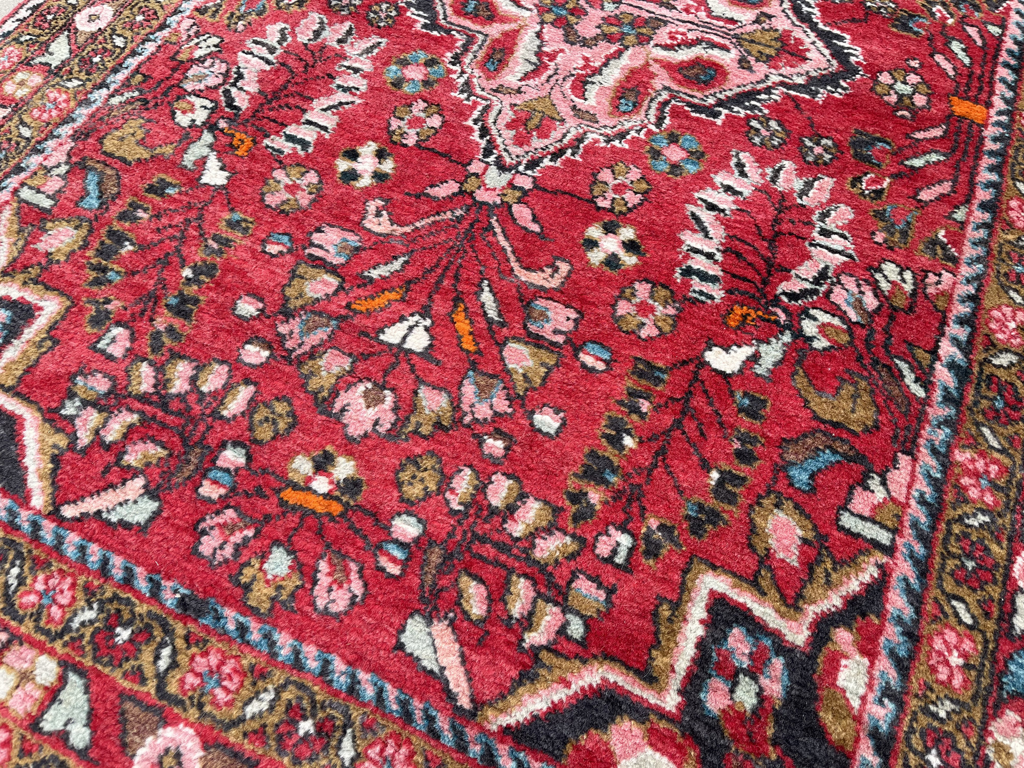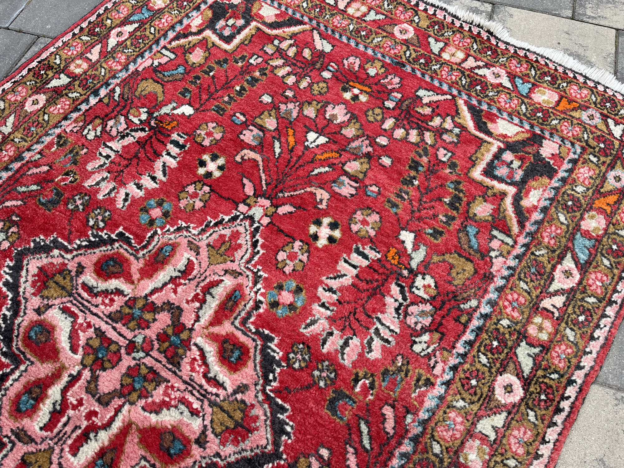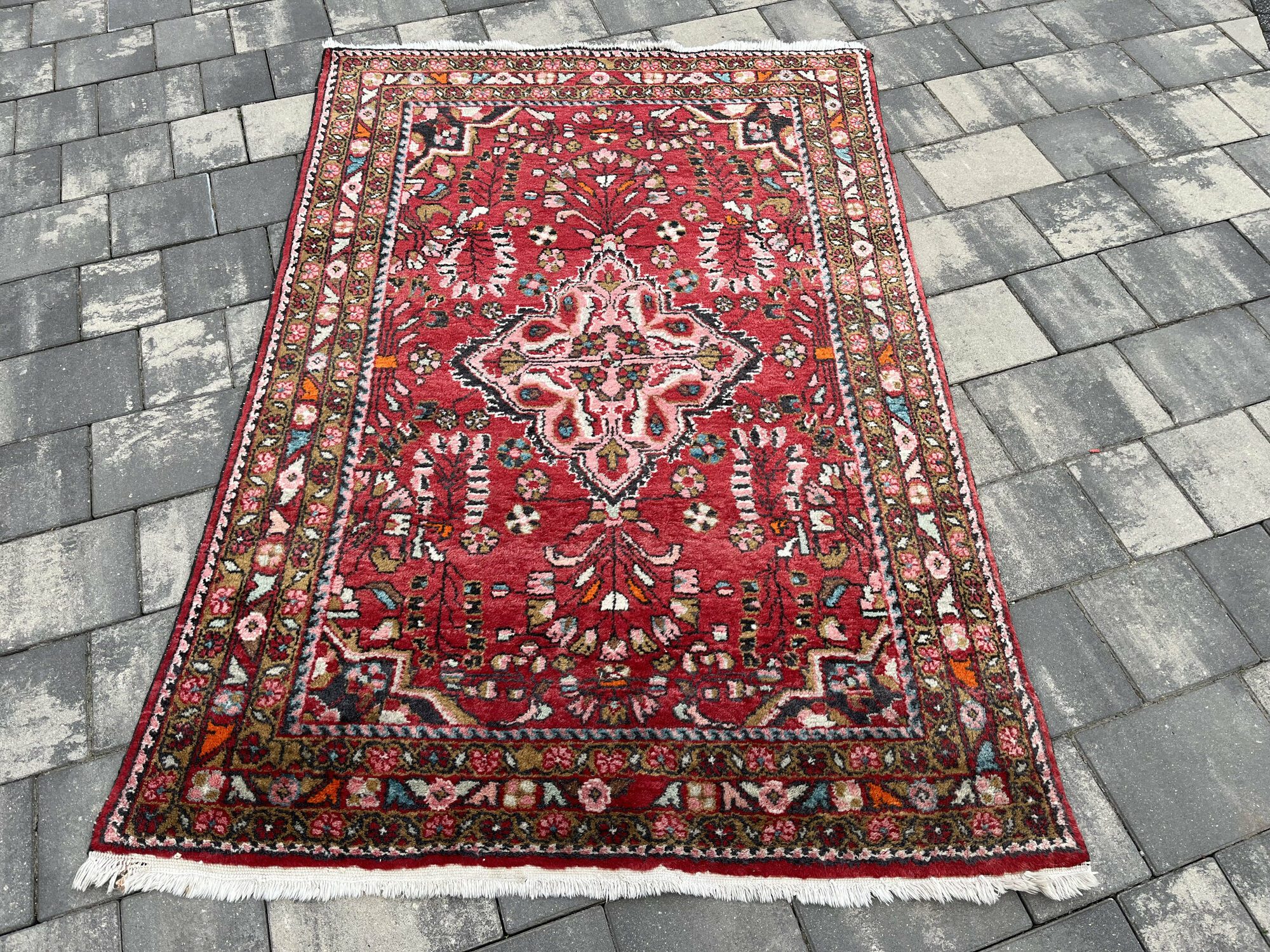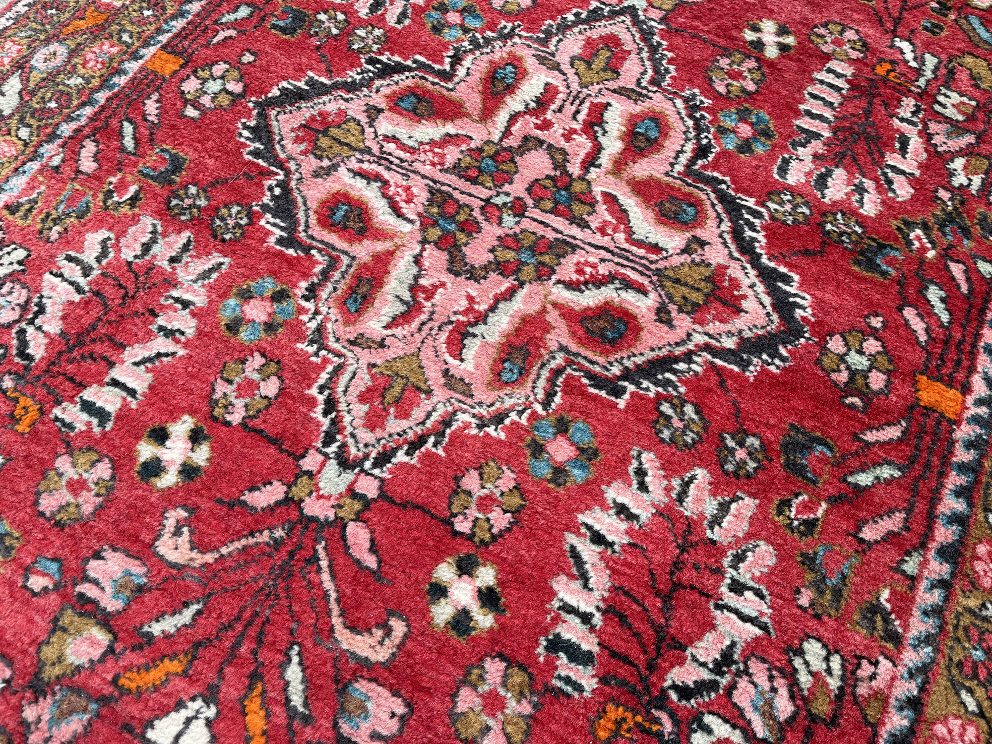 Wzornictwo: Charakterystyczny dla Hamadanów wyrazisty medalion centralny wpisany w pole o intensywnej, czerwonej barwie. Całość dopełnia bogata bordiura z motywami roślinnymi w odcieniach błękitu, różu i zieleni.
