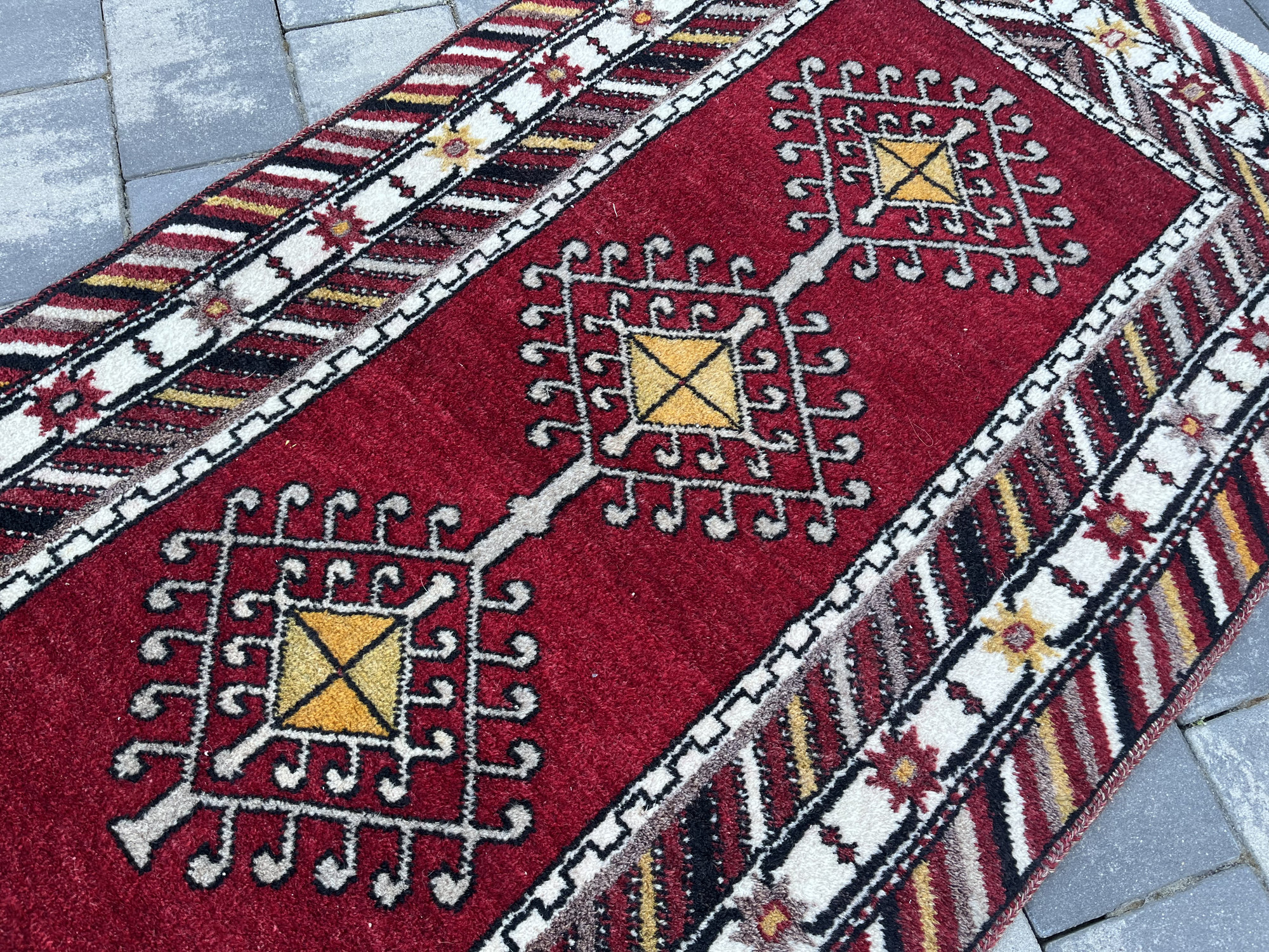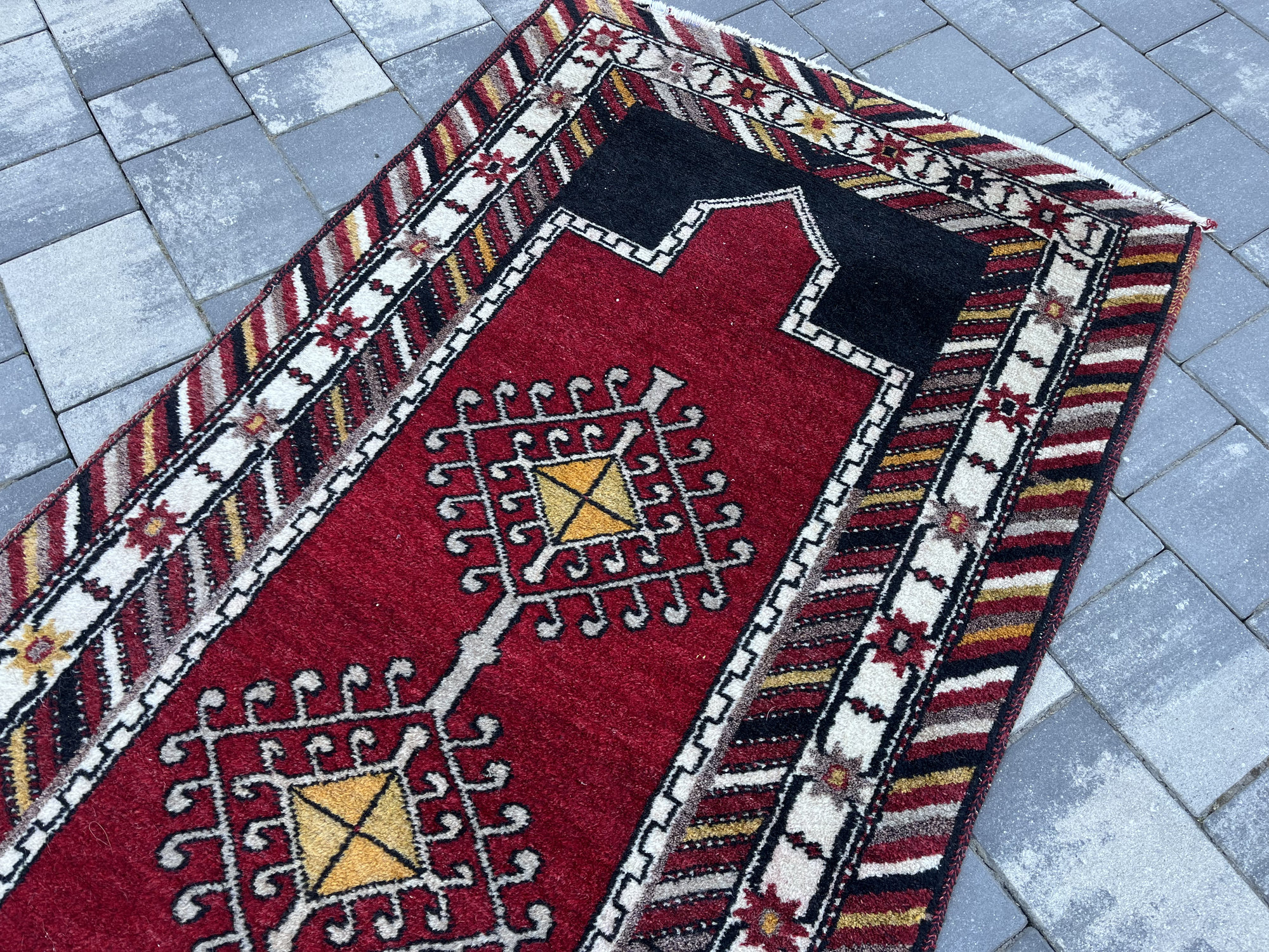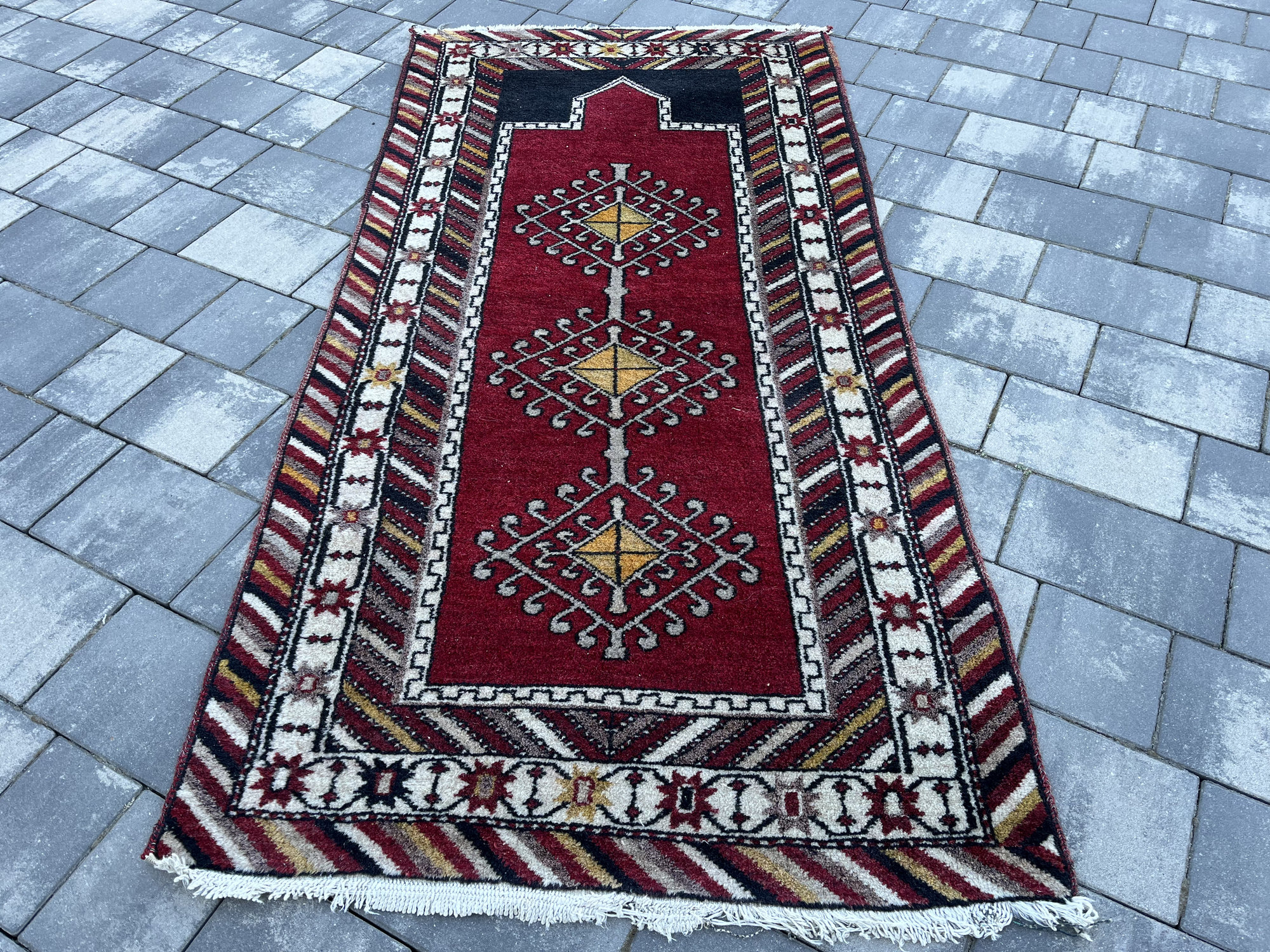 Wzornictwo: Klasyczny układ modlitewny z wyraźnie zaznaczonym łukiem (mihrab) u góry. Środek zdobią trzy geometryczne medaliony z motywami „gwiazd” i totemów. Charakterystyczna, skośna bordiura w pasy nadaje mu dynamiki i unikalnego wyglądu.