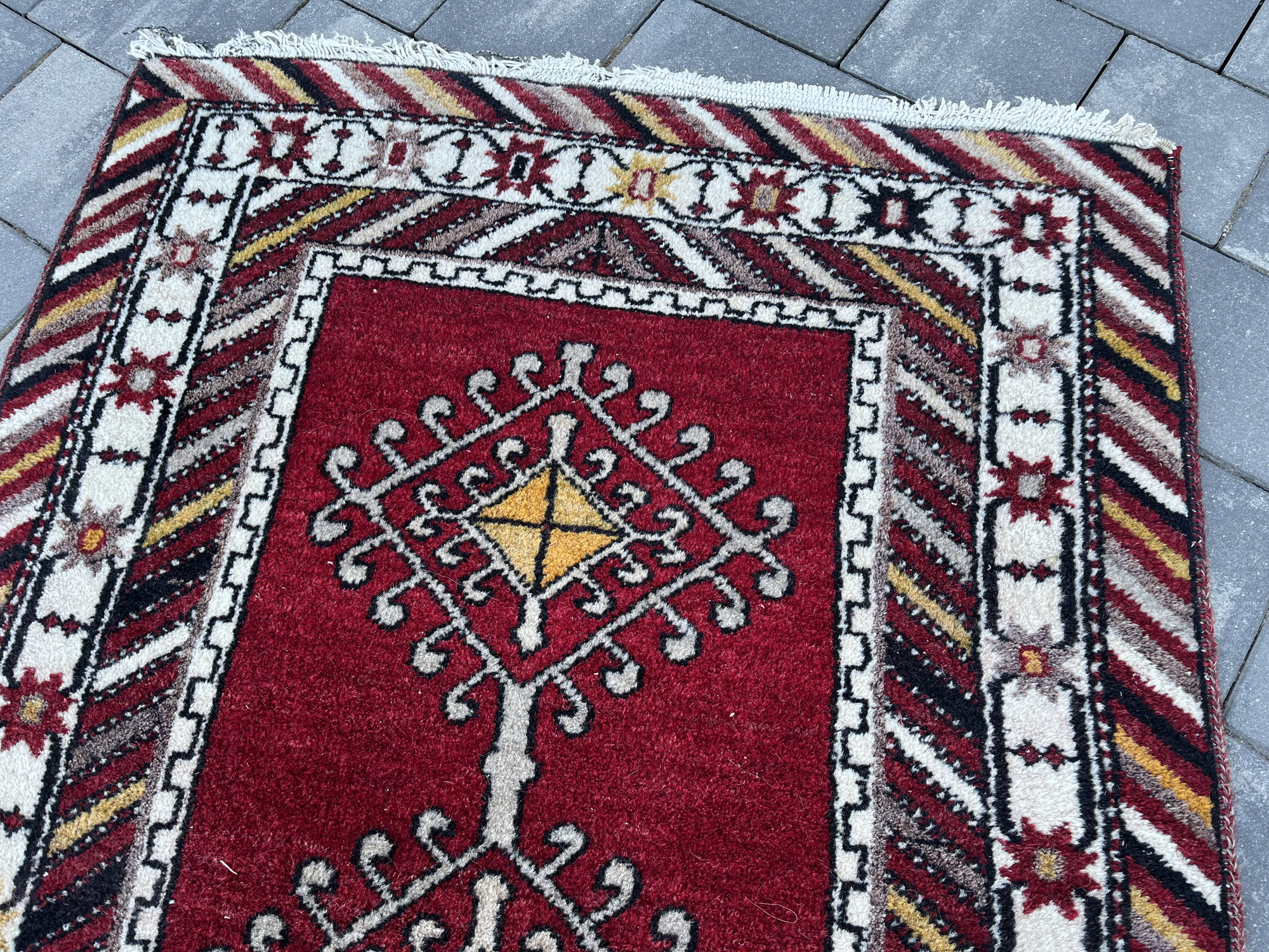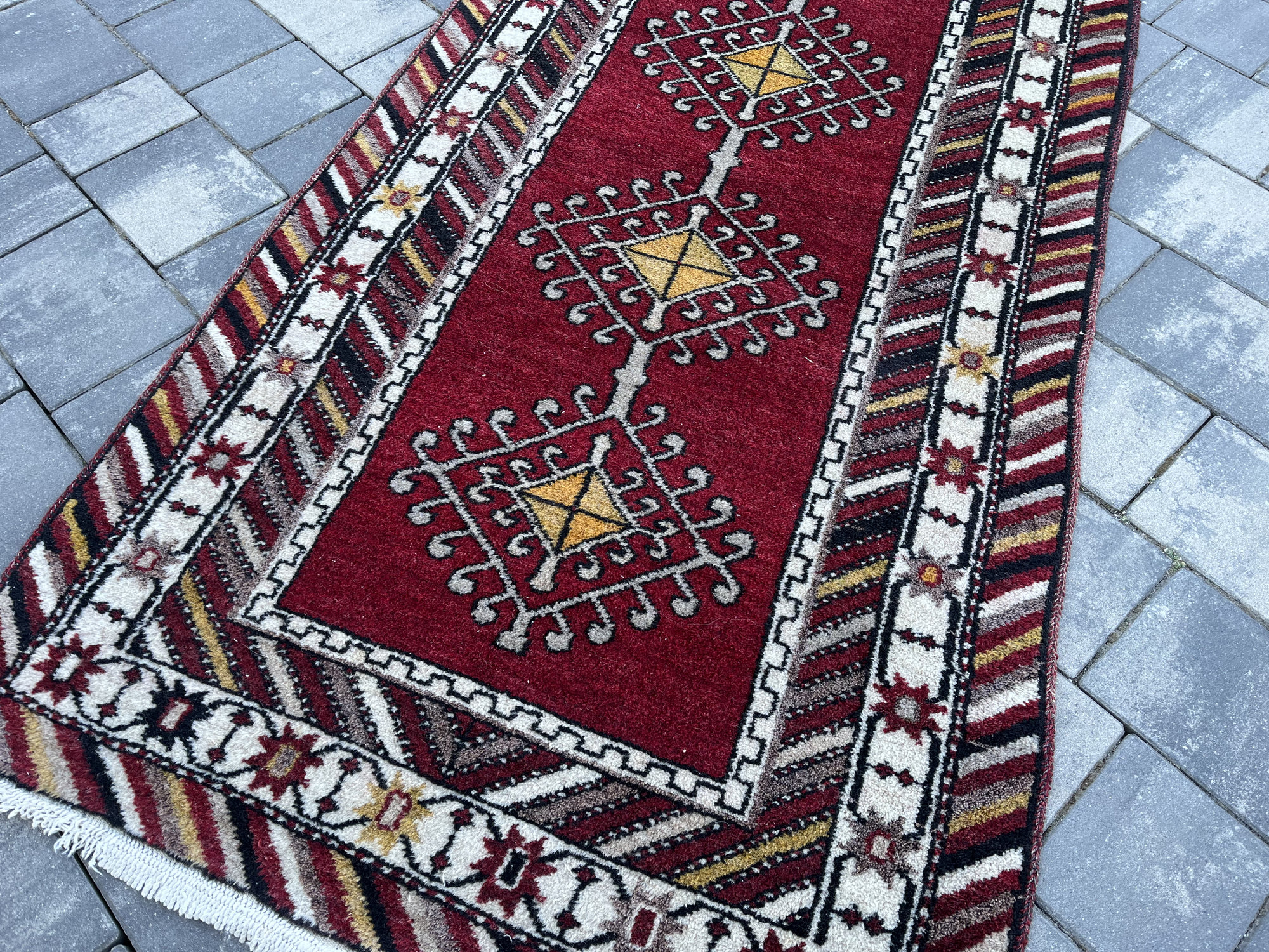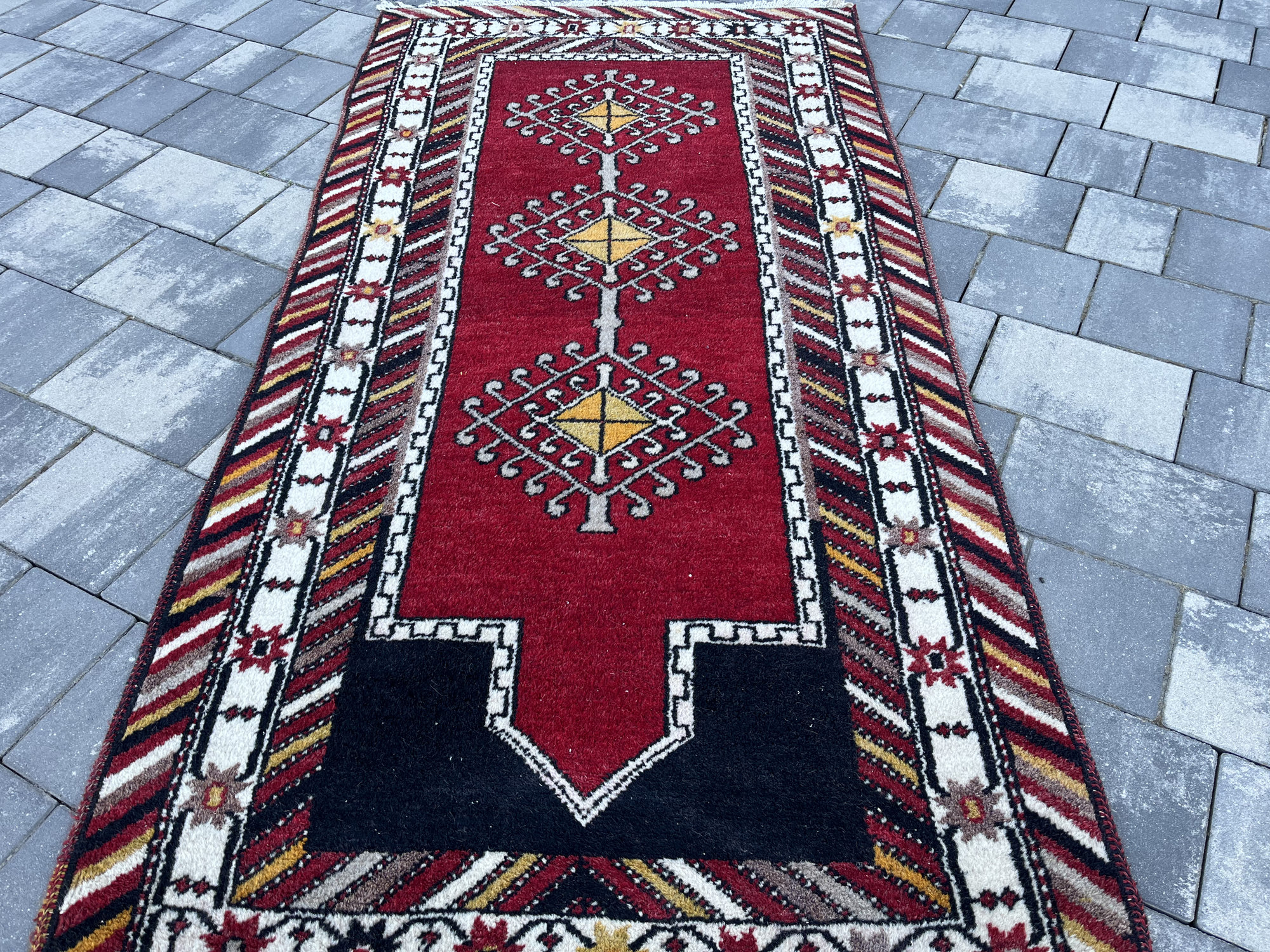 Wzornictwo: Klasyczny układ modlitewny z wyraźnie zaznaczonym łukiem (mihrab) u góry. Środek zdobią trzy geometryczne medaliony z motywami „gwiazd” i totemów. Charakterystyczna, skośna bordiura w pasy nadaje mu dynamiki i unikalnego wyglądu.