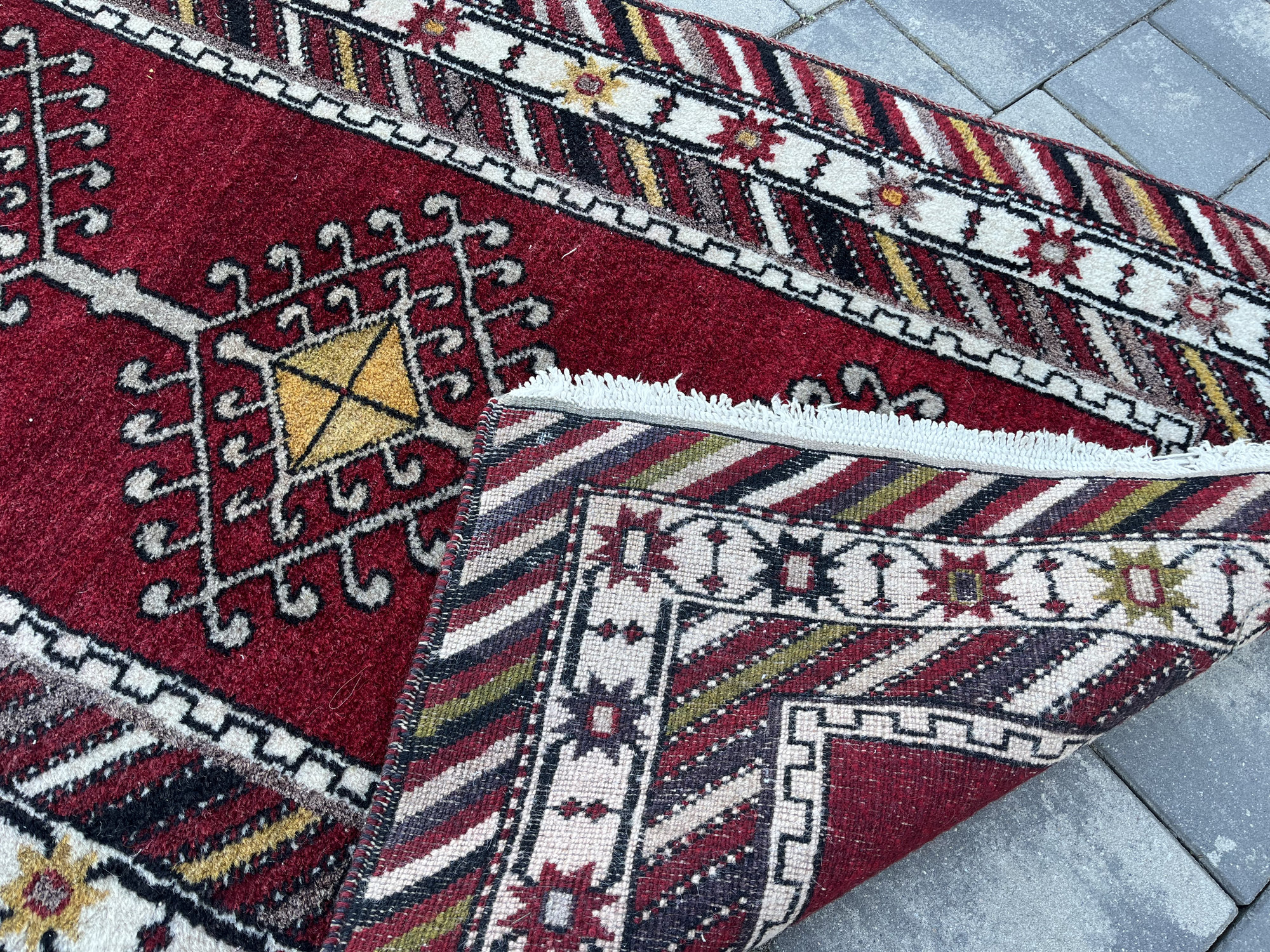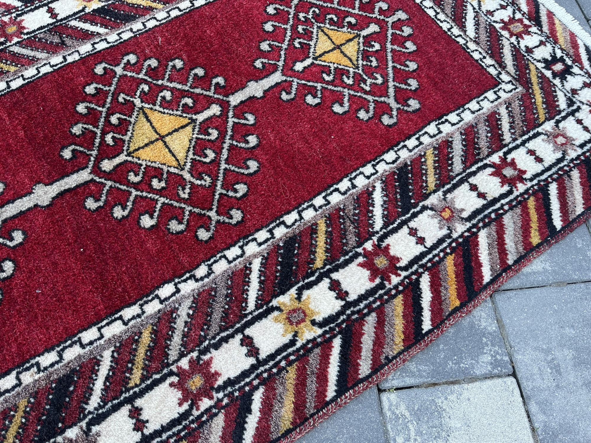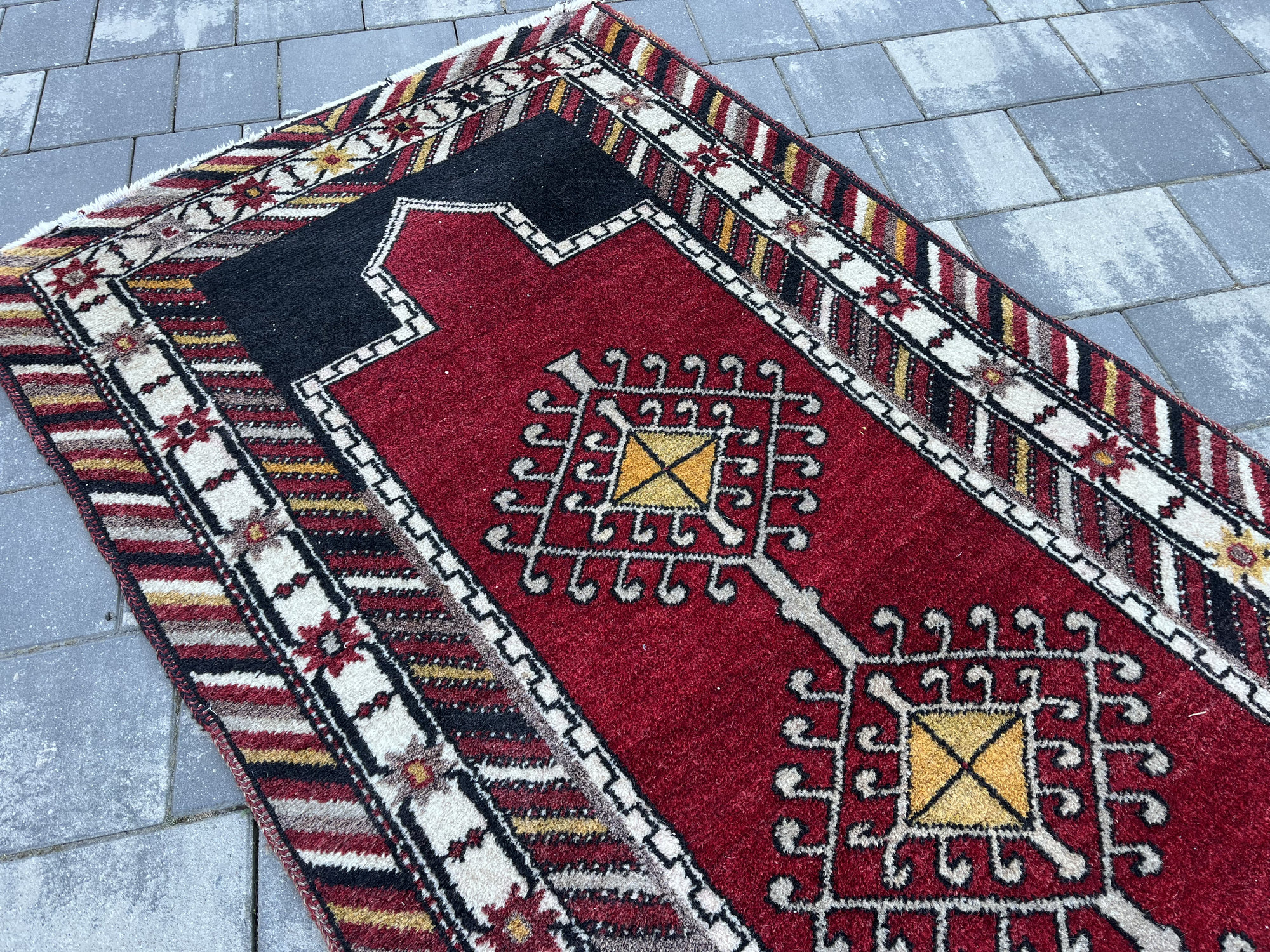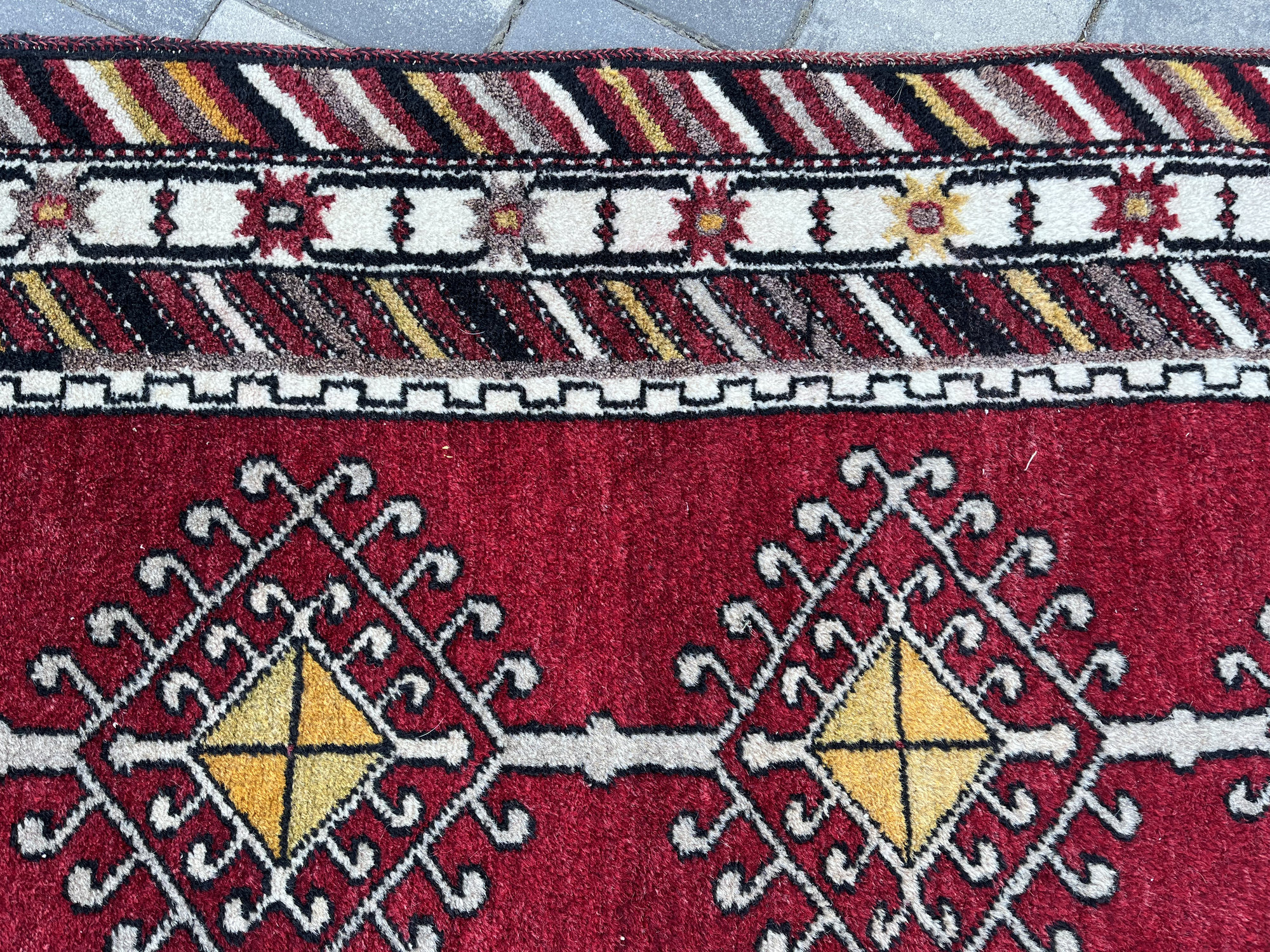 Materiał: 100% naturalna wełna. Dywan charakteryzuje się dość wysokim, miękkim runem i naturalnymi, nasyconymi barwami (czerwień, głęboka czerń, żółć i biel).